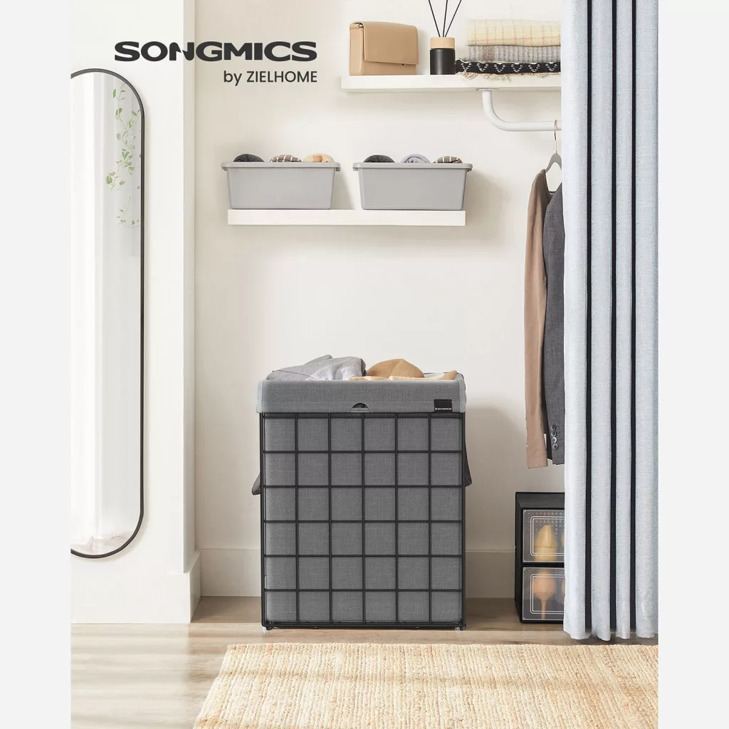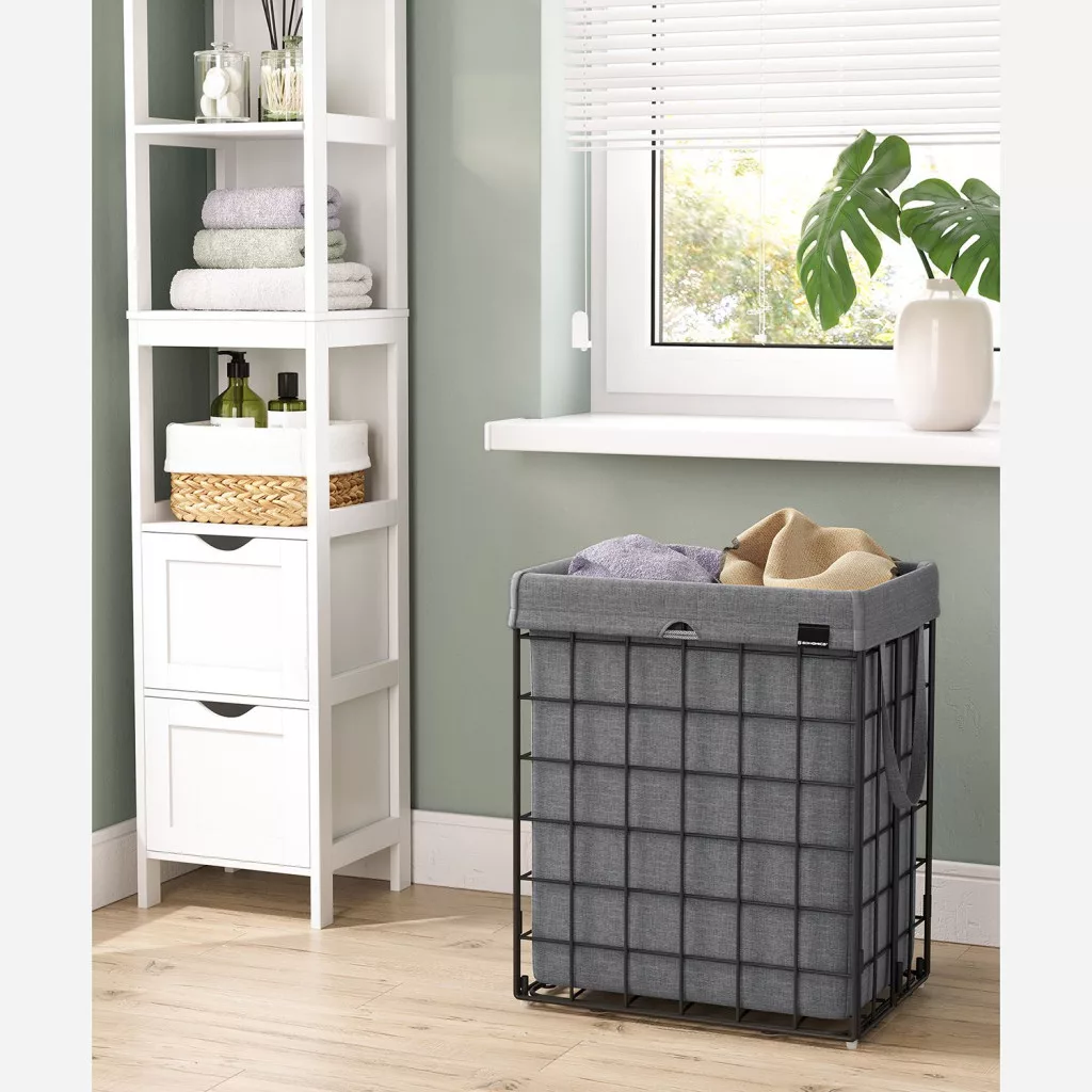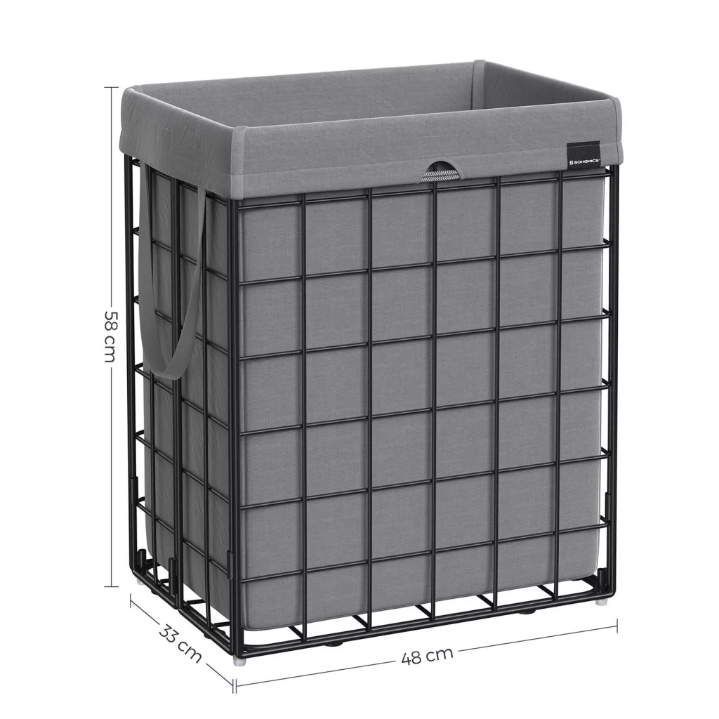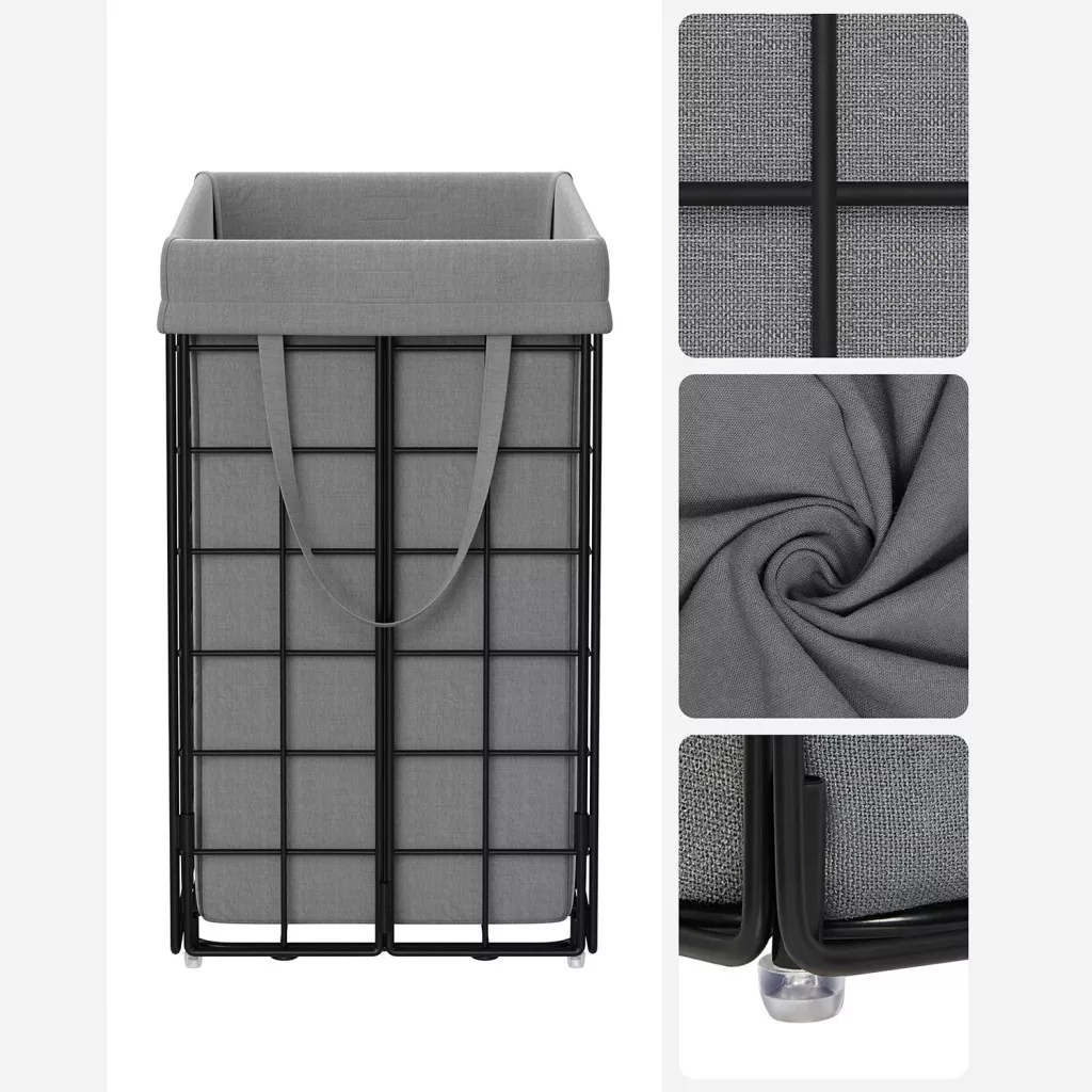 Ez a modern szennyestartó kosár ötvözi a praktikumot és a stílusos megjelenést. A 200 g/m² sűrűségű, lélegző textilzsák és a masszív fémváz együttesen biztosítja a tartósságot, míg a 90 literes kapacitás bőséges helyet kínál a család szennyesének.