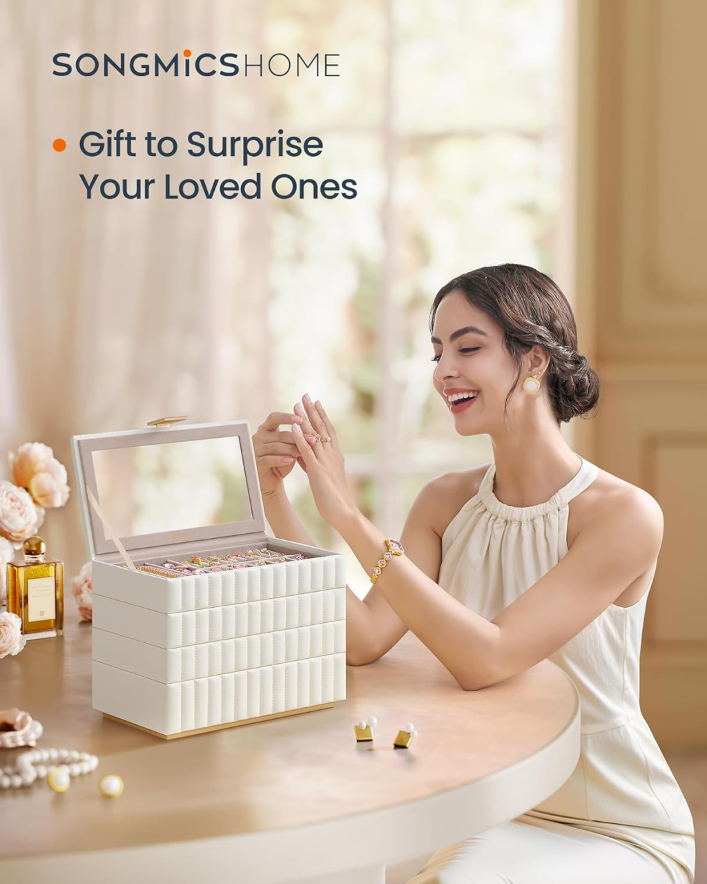 SONGMICS ANAH Négyszintes Ékszertartó Doboz Tükörrel Felhőfehér PU Bőr Borítással
