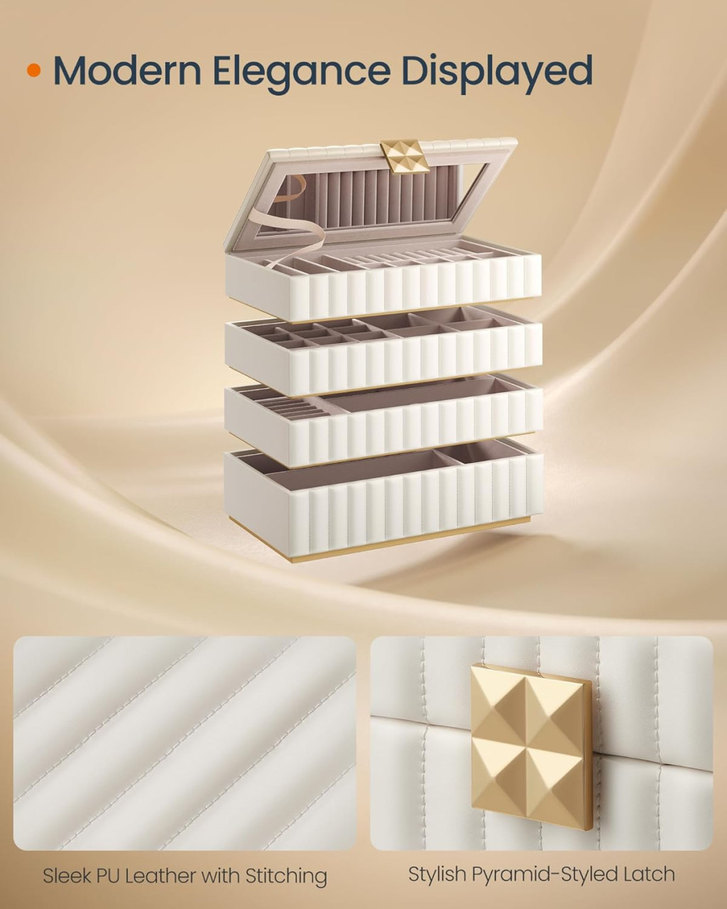 Elegáns, négyszintes ékszertartó doboz beépített tükörrel, steppelt PU bőr borítással és piramis formájú díszítéssel. Tökéletes megoldás ékszerei stílusos tárolására és rendszerezésére.