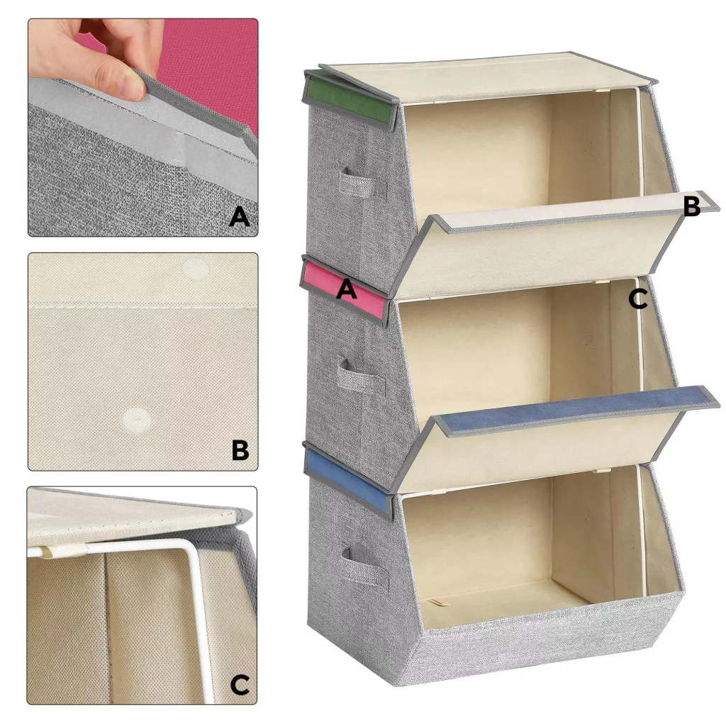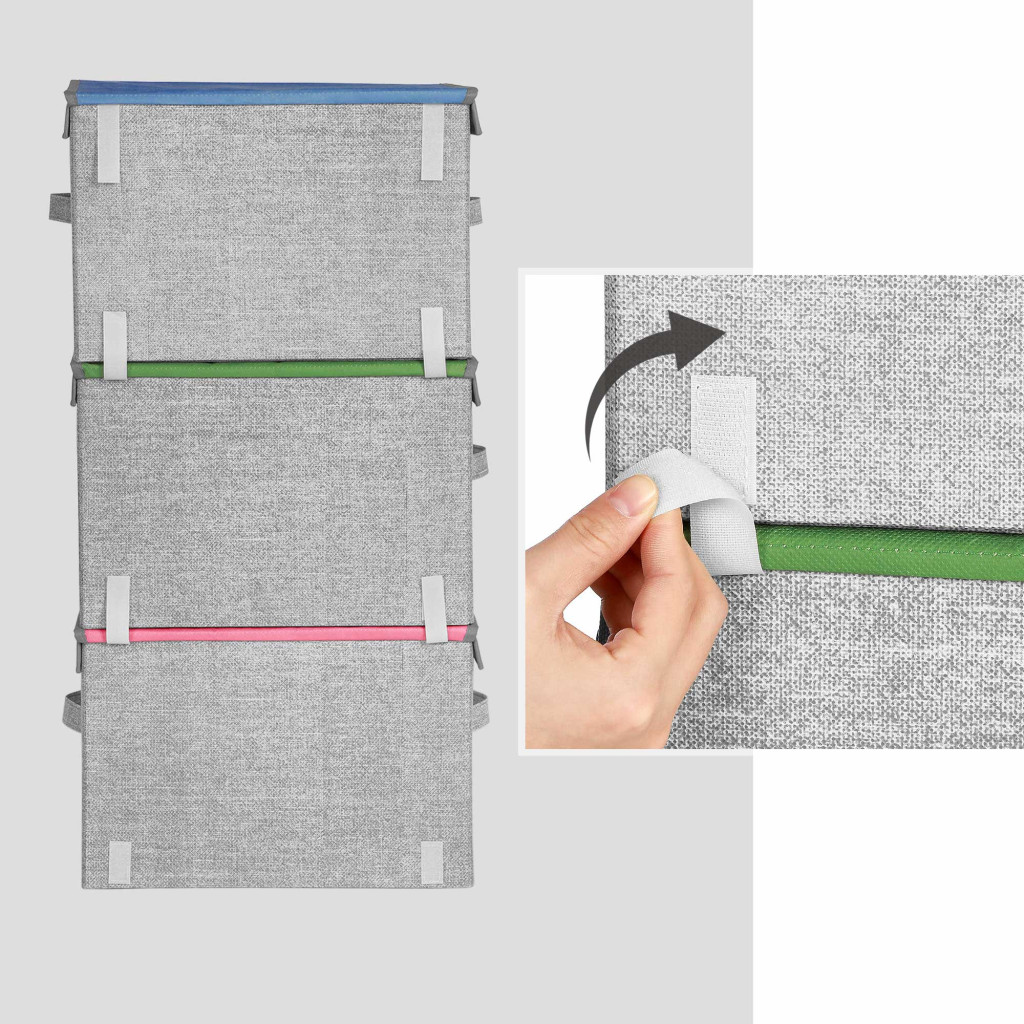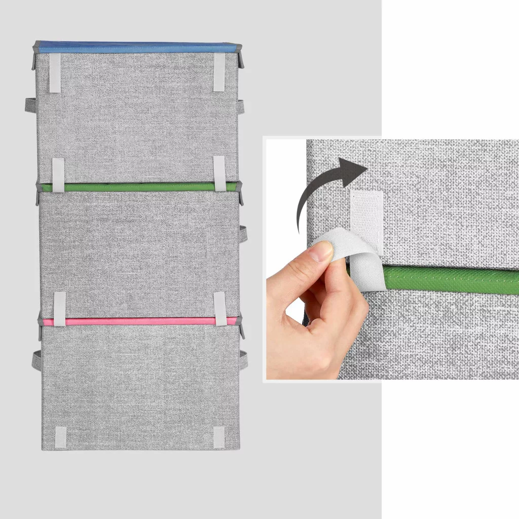 A dobozok könnyű kartonpapírból és nem szőtt anyagból készültek, fém kerettel megerősítve, így tartósak, ugyanakkor könnyen mozgathatók a praktikus fogantyúknak köszönhetően. A mágneses fedél különleges tulajdonsága, hogy nyitott állapotban a felette lévő dobozhoz tapad, megkönnyítve a használatot.