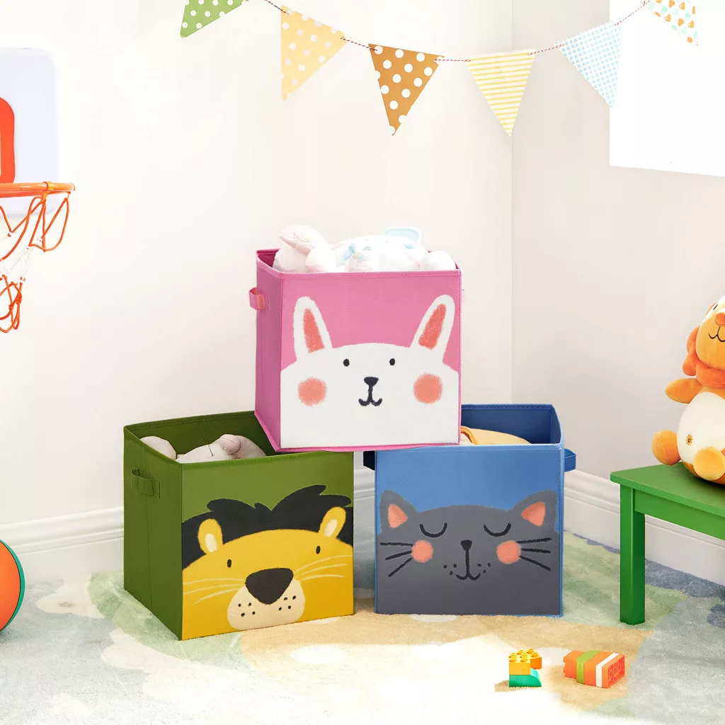 Aranyos állatos mintájú, összecsukható tárolódoboz szett, amely játékosan segít rendet tartani a gyerekszobában három vidám színben: kék, zöld és rózsaszín.