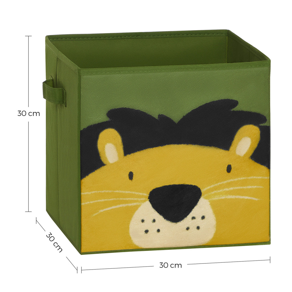 A dobozok praktikus fogantyúkkal rendelkeznek, így a gyerekek is könnyedén mozgathatják őket. A 30x30x30 cm-es méret ideális játékok, könyvek és egyéb gyerekszobai kellékek tárolására, miközben az aranyos állatfigurák játékossá teszik a rendrakást.