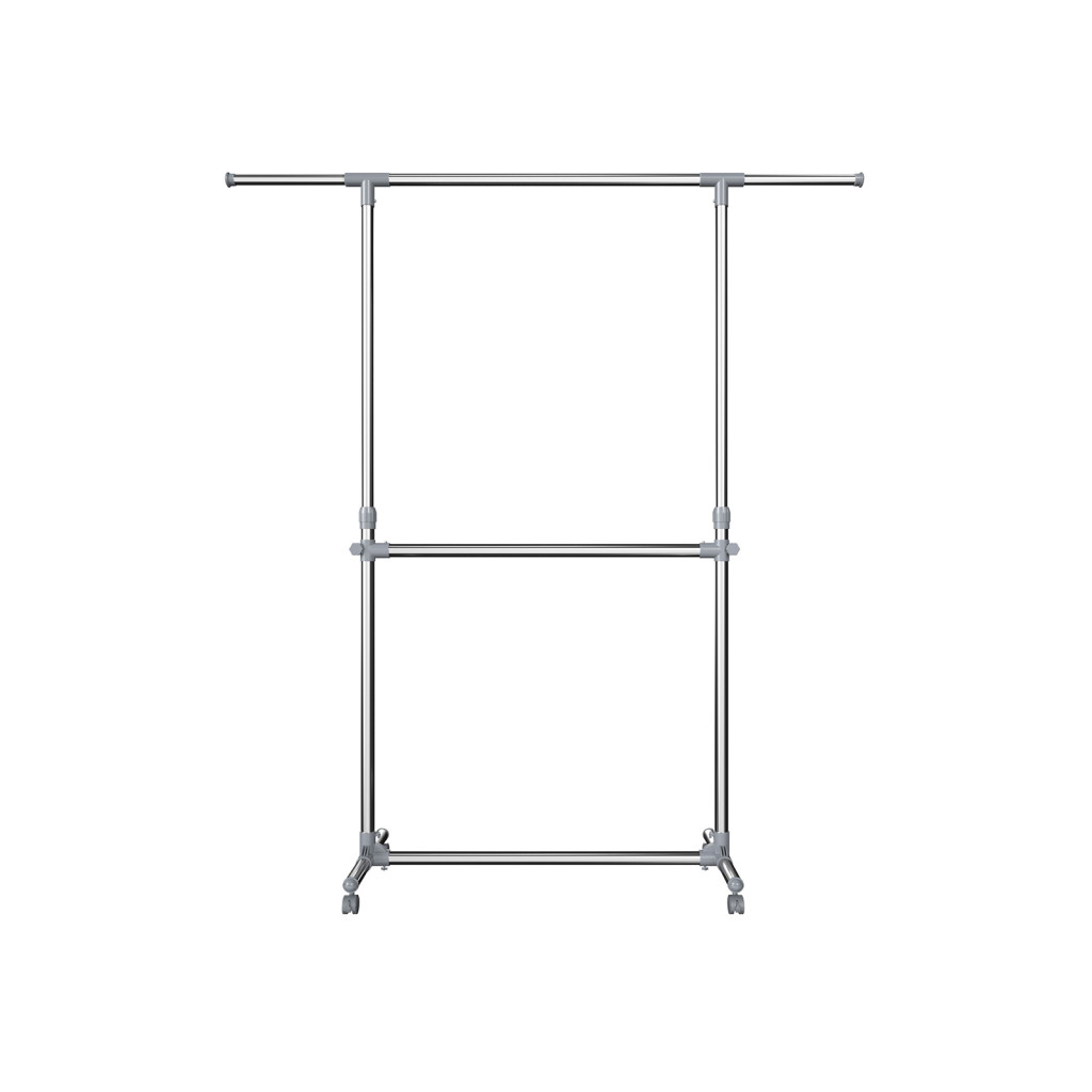 Ez a prémium minőségű ruhaállvány két állítható magasságú rudarendszerrel rendelkezik, amely lehetővé teszi a különböző hosszúságú ruhák praktikus tárolását. A rozsdamentes acél borítású csövek és az erős ABS műanyag csatlakozók biztosítják a tartós használatot.