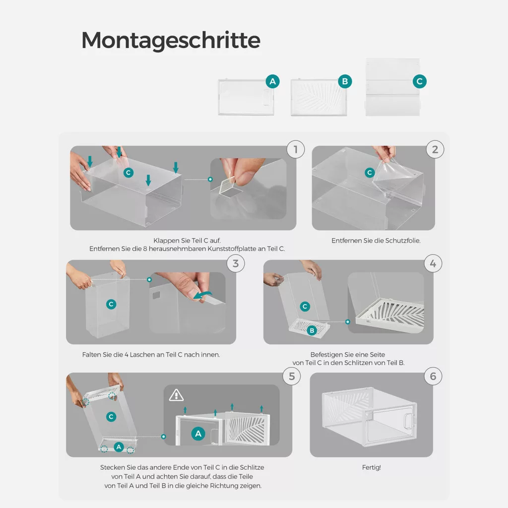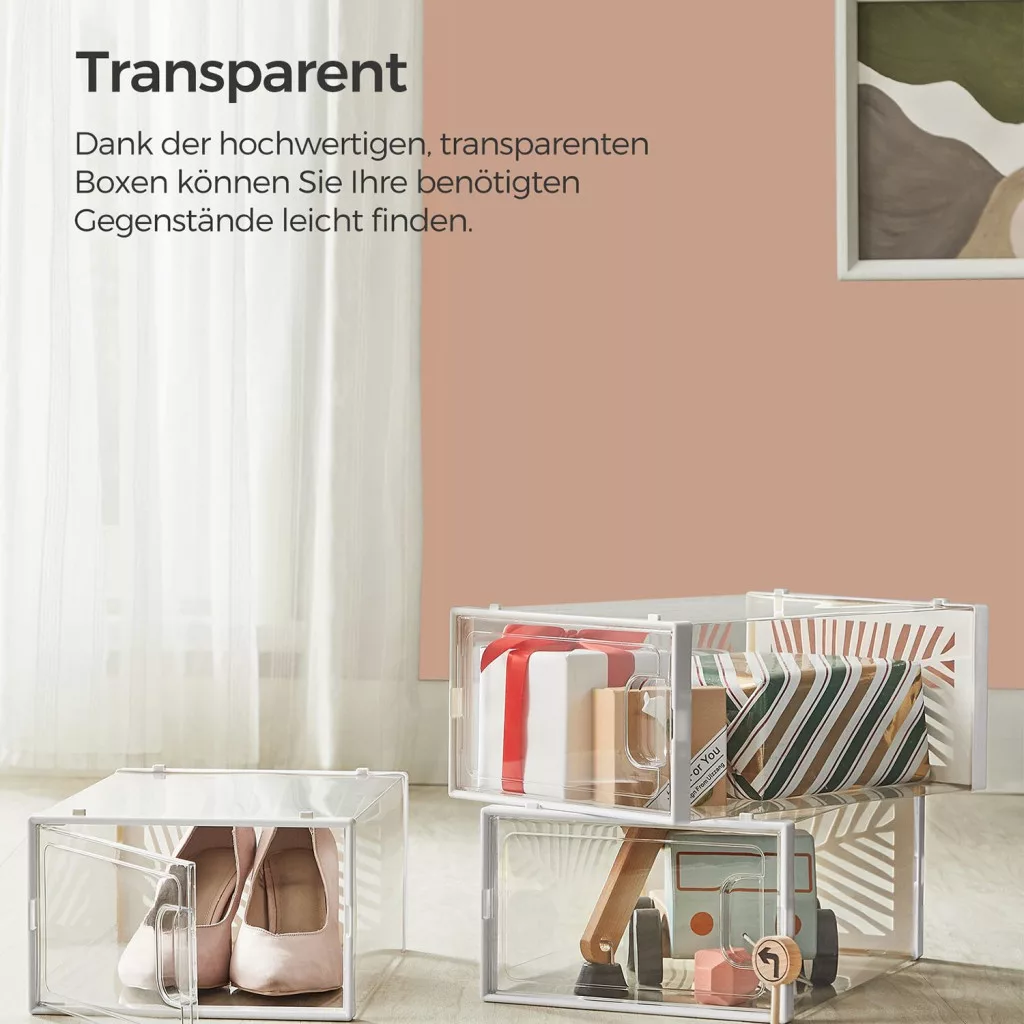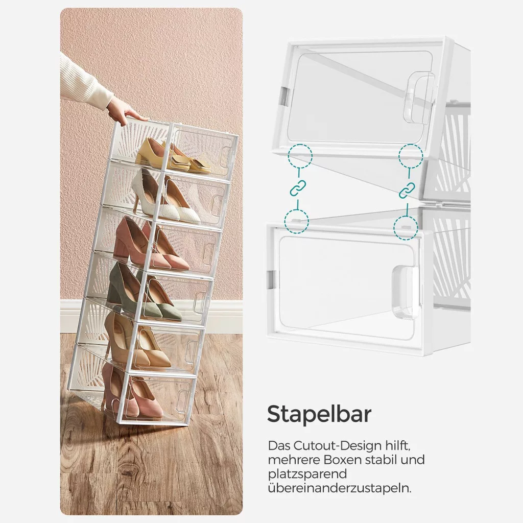 A SONGMICS átlátszó cipősdoboz készlet forradalmasítja a cipőtárolást. A teljesen átlátszó kialakításnak köszönhetően azonnal megtalálja a keresett lábbelit, míg a levél alakú szellőzőnyílások biztosítják a megfelelő légáramlást. A dobozok stabil ABS kerettel rendelkeznek, ami lehetővé teszi a biztonságos egymásra helyezést.