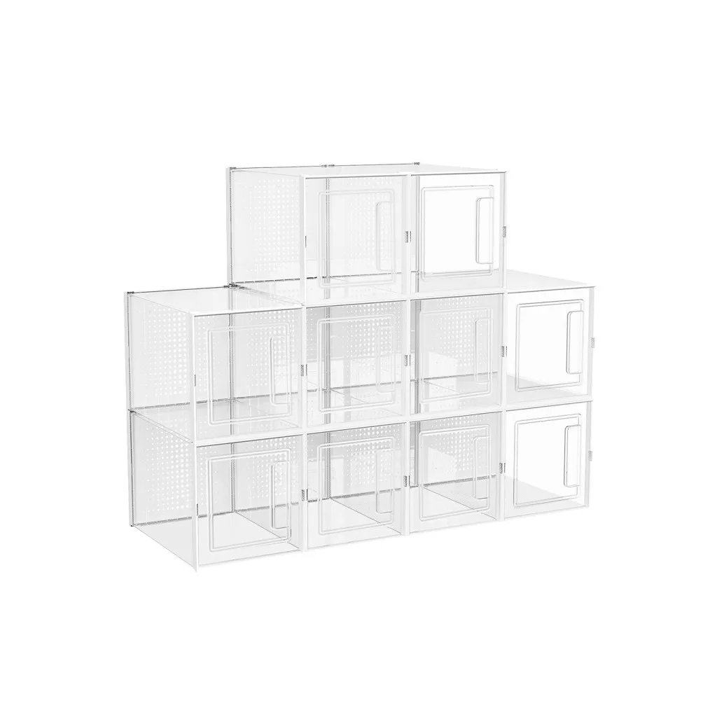 Praktikus, átlátszó cipőtároló rendszer 10 darabos szettben, kifejezetten magas sarkú cipők és csizmák tárolására tervezve. Átlátszó ajtajának köszönhetően könnyű áttekinthetőséget biztosít.