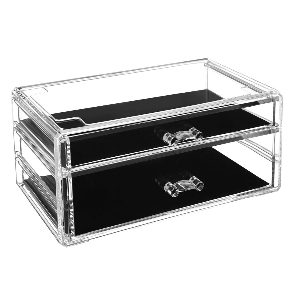 Elegáns, kétszintes kozmetikai rendszerező átlátszó polisztirolból, 5 különböző méretű fiókkal a sminkek és ékszerek rendezett tárolásához.