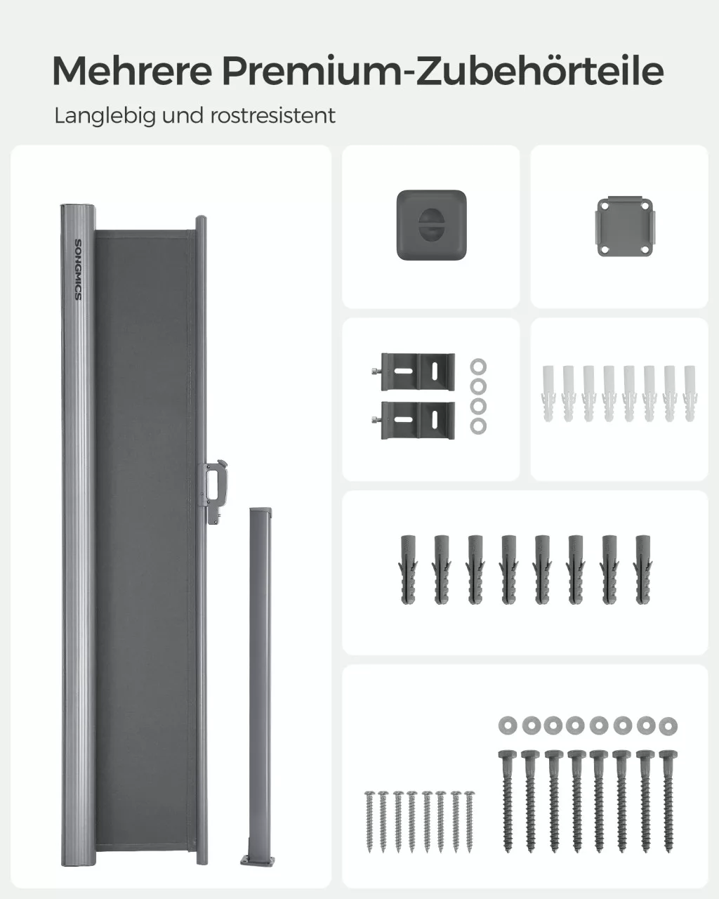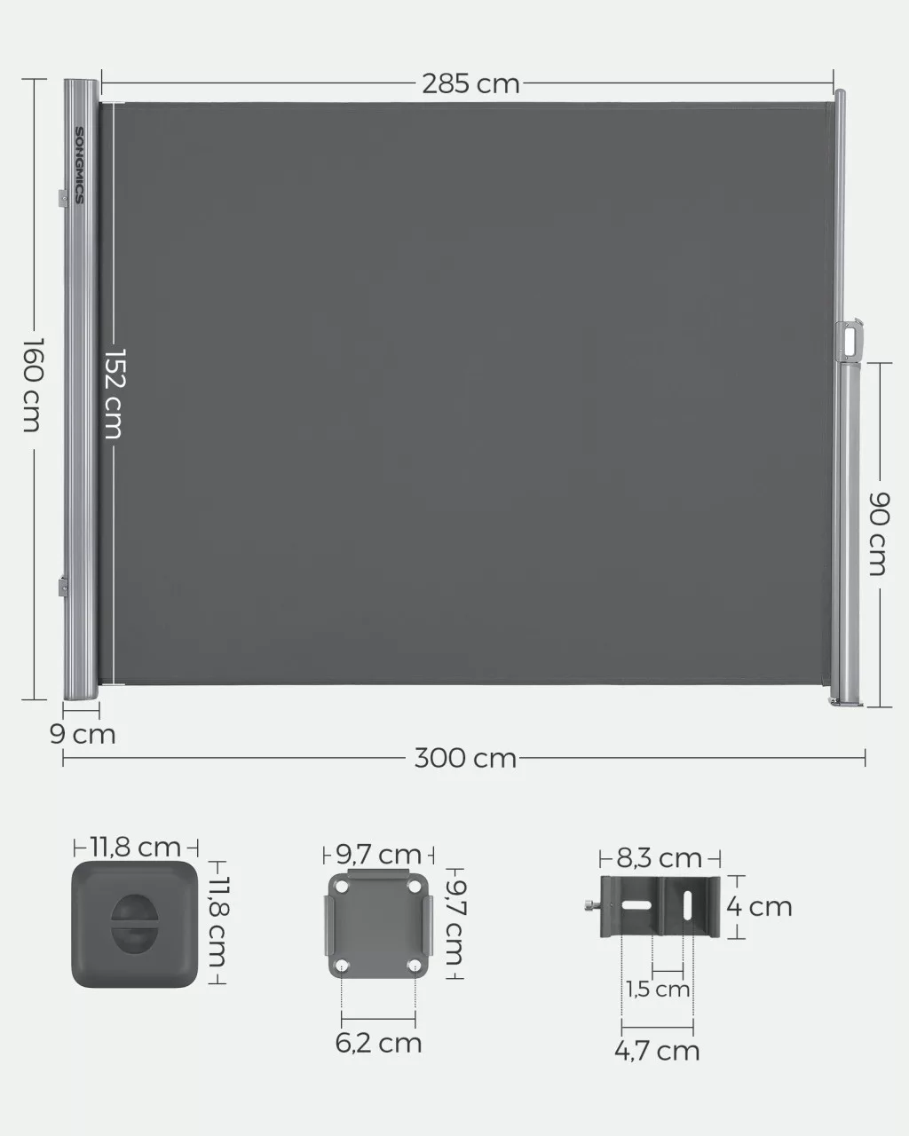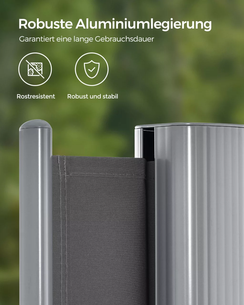 A SONGMICS oldalsó napellenző egy innovatív megoldás a terasz vagy kert árnyékolására. A beépített automata visszahúzó rendszernek köszönhetően egyszerűen kezelhető, míg a 280 g/m² sűrűségű poliészter anyag hatékony védelmet biztosít a napsugárzás ellen. A PU bevonat garantálja a vízállóságot és a könnyű tisztíthatóságot.