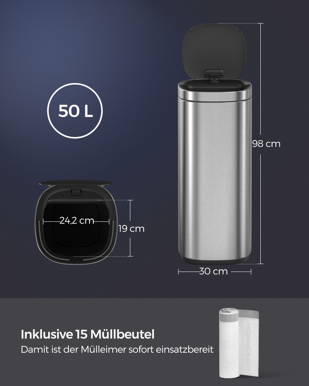 Ez a korszerű konyhai szemetes ötvözi az intelligens technológiát a praktikus kialakítással. A 0,3 másodperces reakcióidejű mozgásérzékelő lehetővé teszi a fedél érintésmentes nyitását, míg az ózonos szagtalanító rendszer hatékonyan semlegesíti a kellemetlen szagokat.