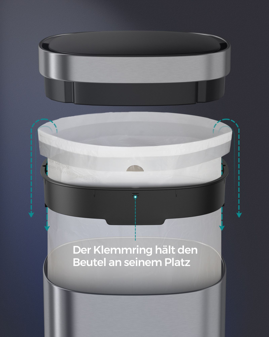 • Zsákrögzítő gyűrű: Biztosítja a szemetes zsák stabil rögzítését