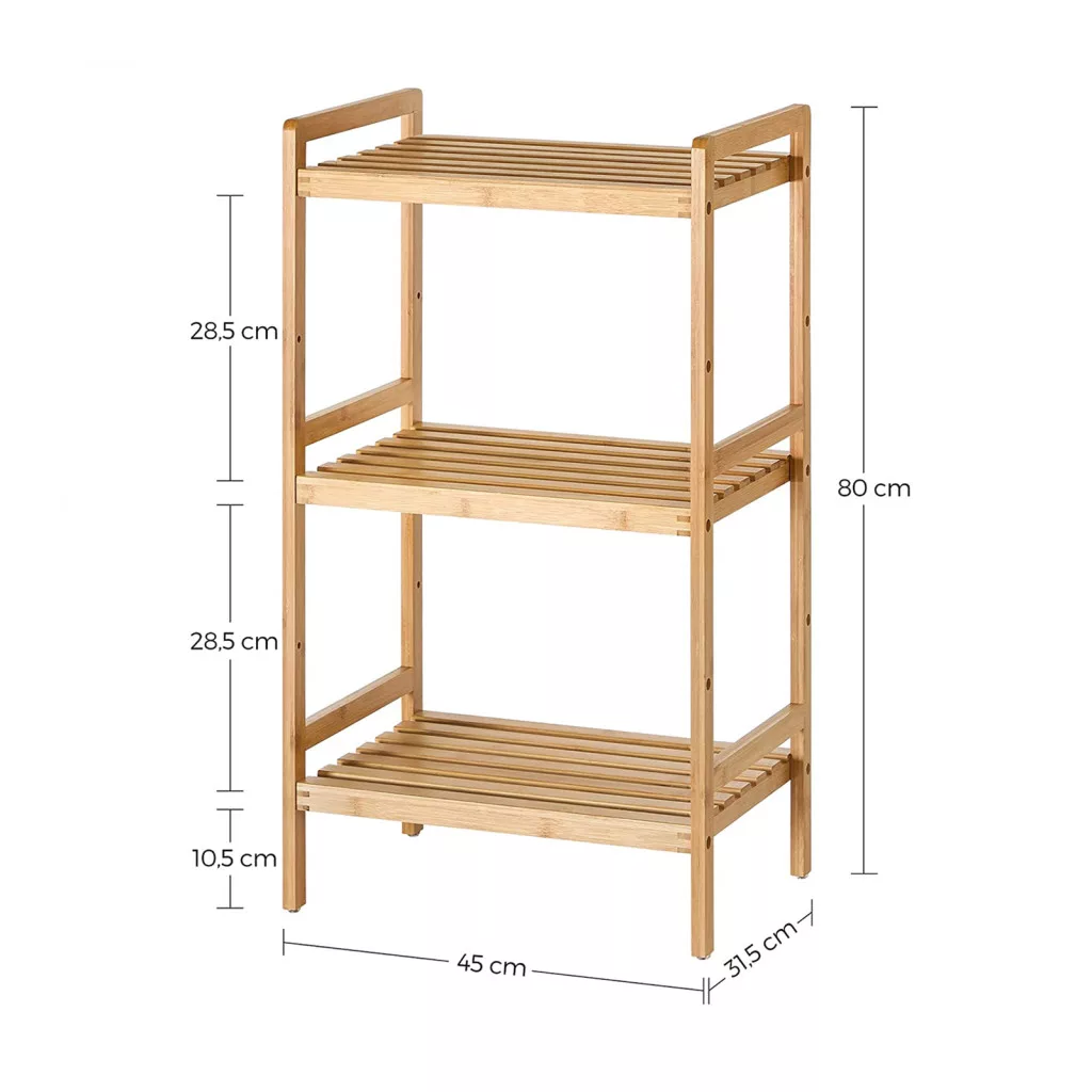 A SONGMICS bambusz tároló polc a funkcionalitás és az esztétika tökéletes ötvözete. A természetes bambusz anyag meleg, organikus megjelenést kölcsönöz otthonának, miközben tartós és stabil tárolási megoldást biztosít. A 3 szintes kialakítás maximalizálja a függőleges teret, így még kisebb helyiségekben is hatékonyan rendszerezheti tárgyait anélkül, hogy értékes padlóterületet foglalna el.