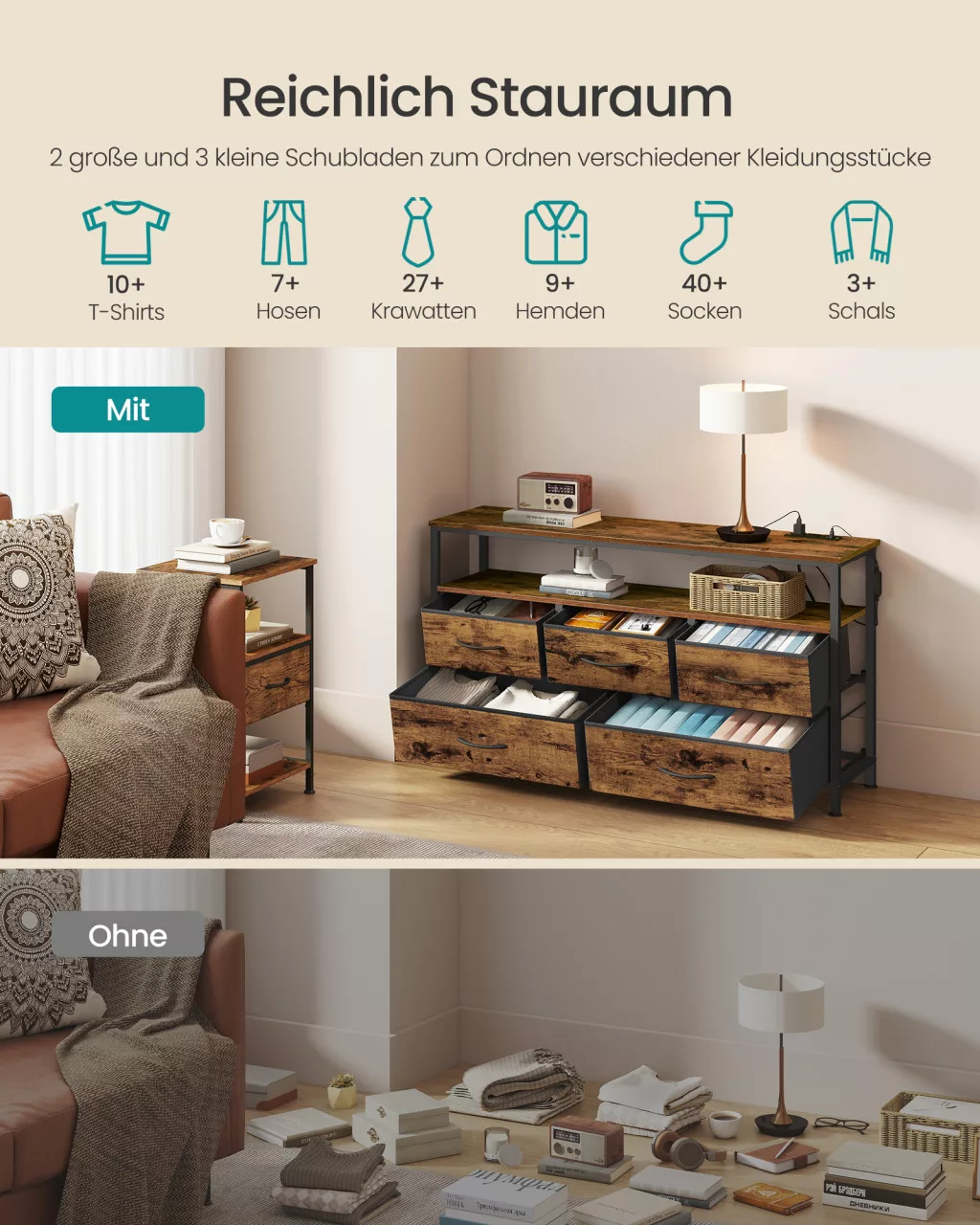 • Bőséges tárolókapacitás: 5 fiók és nyitott polc rendszerezi ruháidat és tárgyaidat, miközben a tetőlap dekorációs felületet kínál