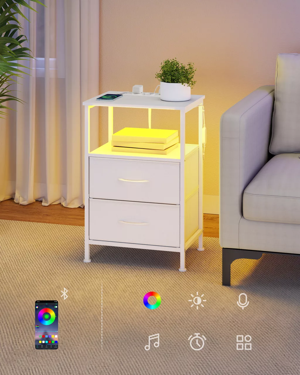 Az applikációval vezérelhető LED világítás különleges hangulatot teremt a hálószobában - szabadon állíthatod a színeket és a fényerőt, szinkronizálhatod zenével vagy mikrofonnal, sőt időzítheted is a be- és kikapcsolást. Az 1 nyitott rekesz és 2 tágas fiók bőséges tárolóhelyet kínál minden olyan tárgy számára, amelyet éjszaka kéznél szeretnél tartani. A kompakt méretnek köszönhetően a szekrény bárhol elhelyezhető - akár hálószobában, akár nappali kanapé mellett.
