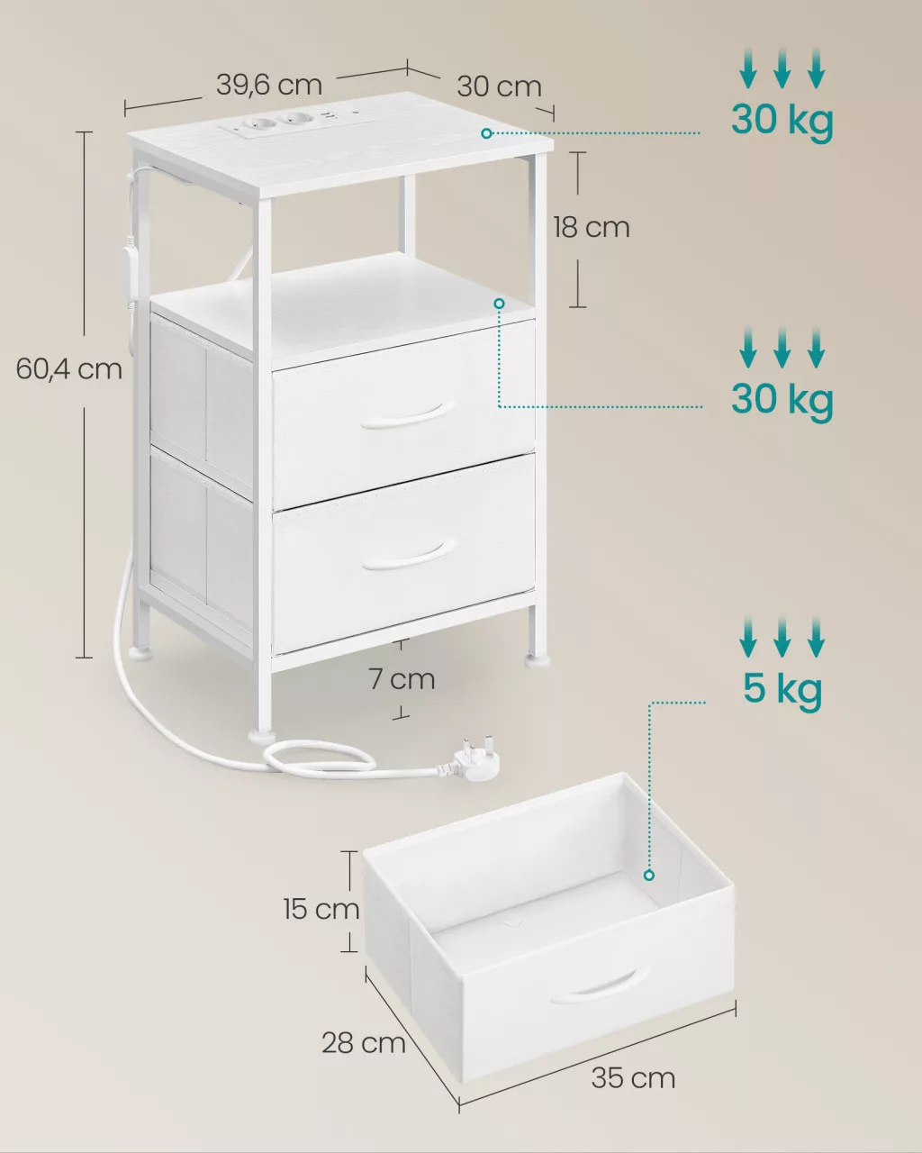 A SONGMICS BELLAH kollekció éjjeliszekrénye tökéletes választás azok számára, akik a modern dizájnt és a praktikus funkciókat keresik. Az elegáns felhőfehér színű bútor acél vázszerkezettel és fa anyagokkal készült, amely nemcsak stabil, hanem vizuálisan is vonzó megjelenést biztosít. A beépített töltőállomás 2 hagyományos aljzattal, 2 USB-A és 1 USB-C porttal rendelkezik, így minden eszközöd egyidejűleg tölthető az éjszaka folyamán.
