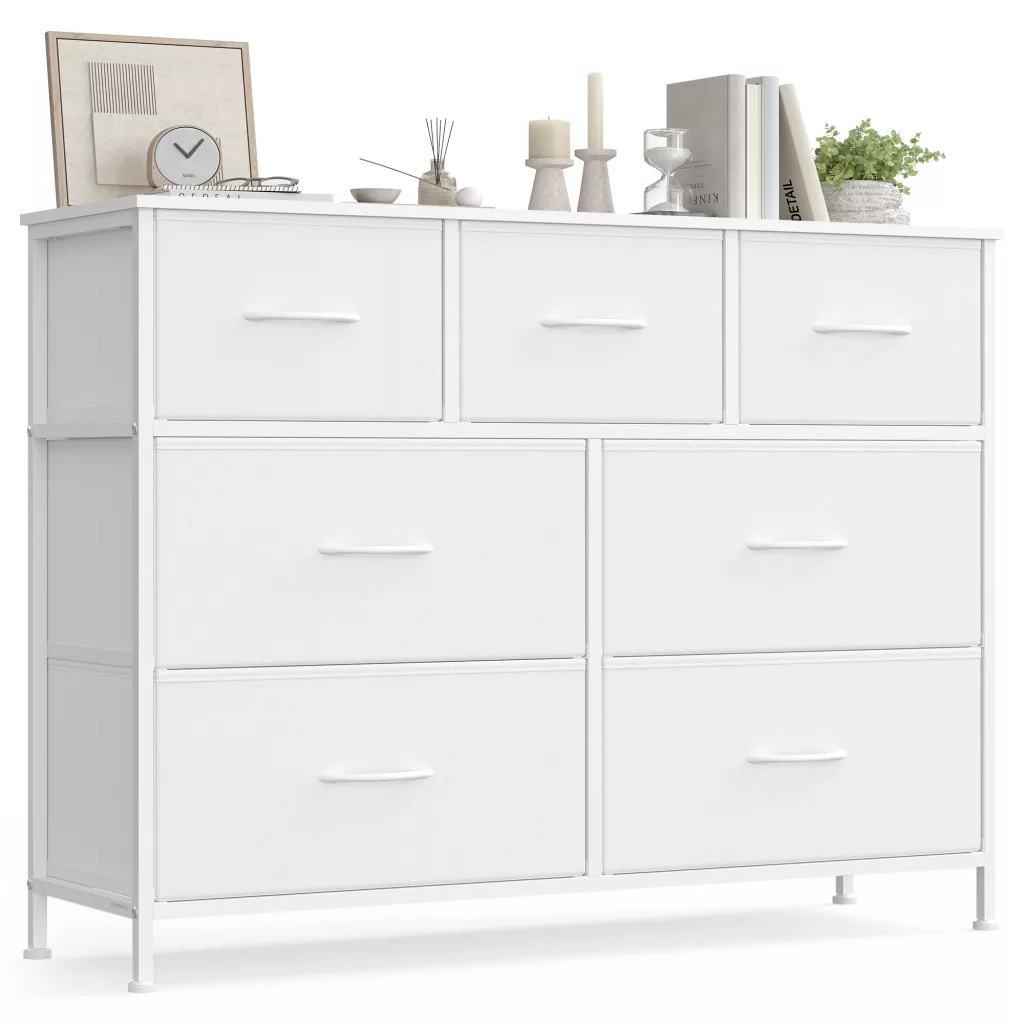 • Bőséges tárolókapacitás: 4 nagy és 3 kis fiók különböző méretű ruhadarabok és kiegészítők típus szerinti rendszerezéséhez, a felső felület pedig tökéletes hely lámpáknak és dekorációknak