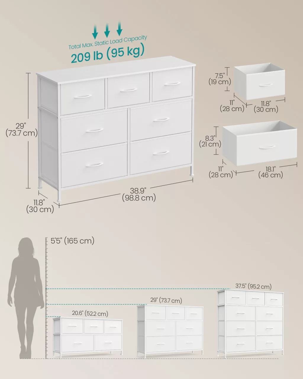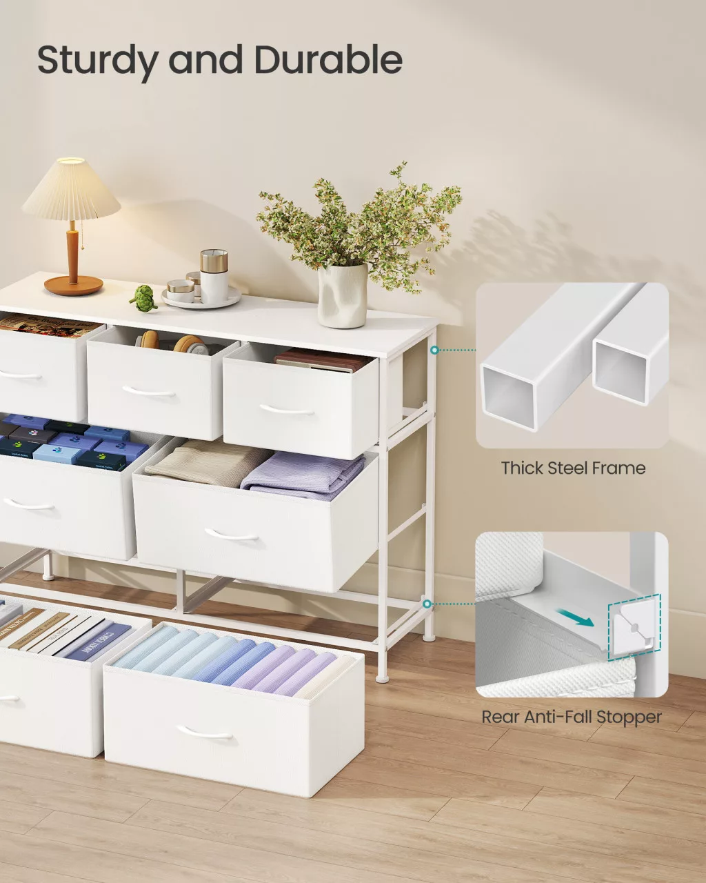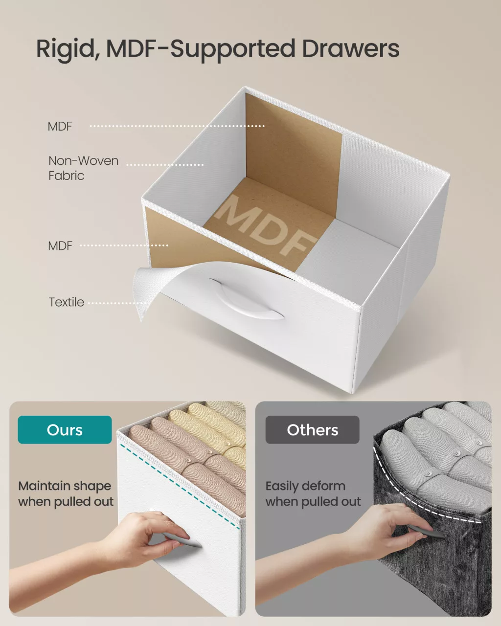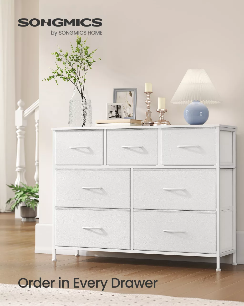 A SONGMICS BELLAH kollekció fiókos szekrénye az acél, a műszaki fa és a textil tökéletes ötvözete, amely erőt, lágyságot és praktikus tárolást biztosít egyszerre. A modern, felhőfehér és hófehér színvilág bármilyen lakberendezési stílusba harmonikusan illeszkedik, legyen szó hálószobáról, gardróbról, előszobáról vagy nappaliról. A 7 fiók - 4 nagy és 3 kisebb - bőséges tárolóhelyet kínál ruházat, fehérnemű és kiegészítők rendszerezett elhelyezéséhez.