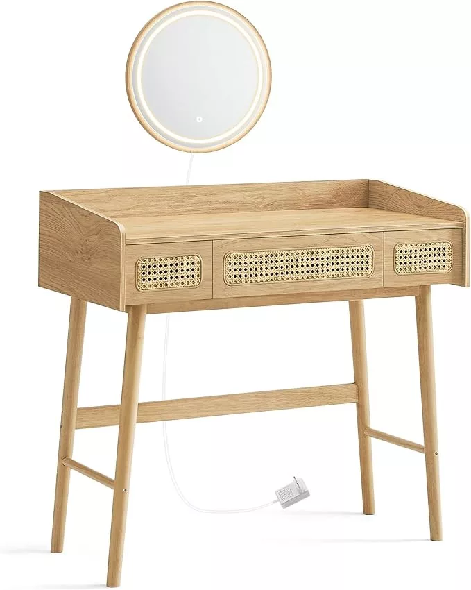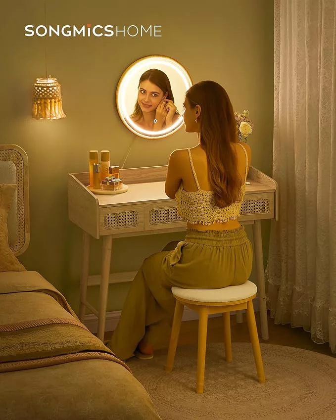 SONGMICS BOHOVEN Fésülködőasztal LED Tükörrel Rattan Hatású Fiókokkal Tölgy Bézs