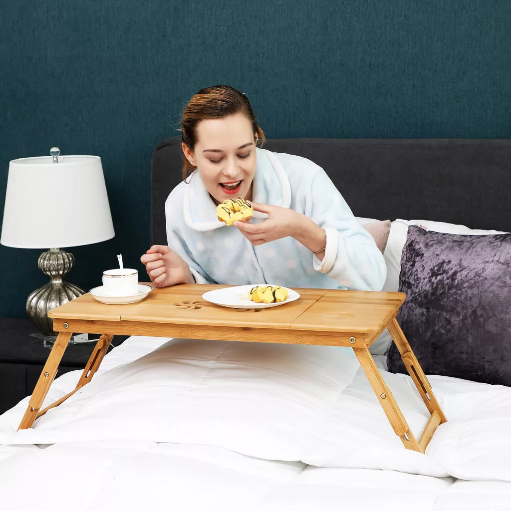Sokoldalú, összecsukható bambusz laptop asztal állítható magassággal és dőlésszöggel, ideális ágyban vagy kanapén történő munkavégzéshez és étkezéshez.