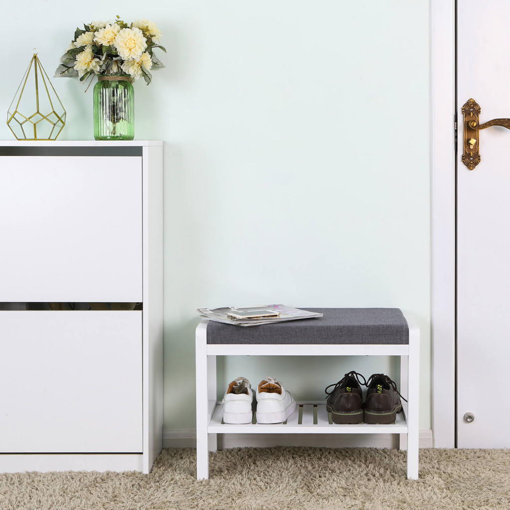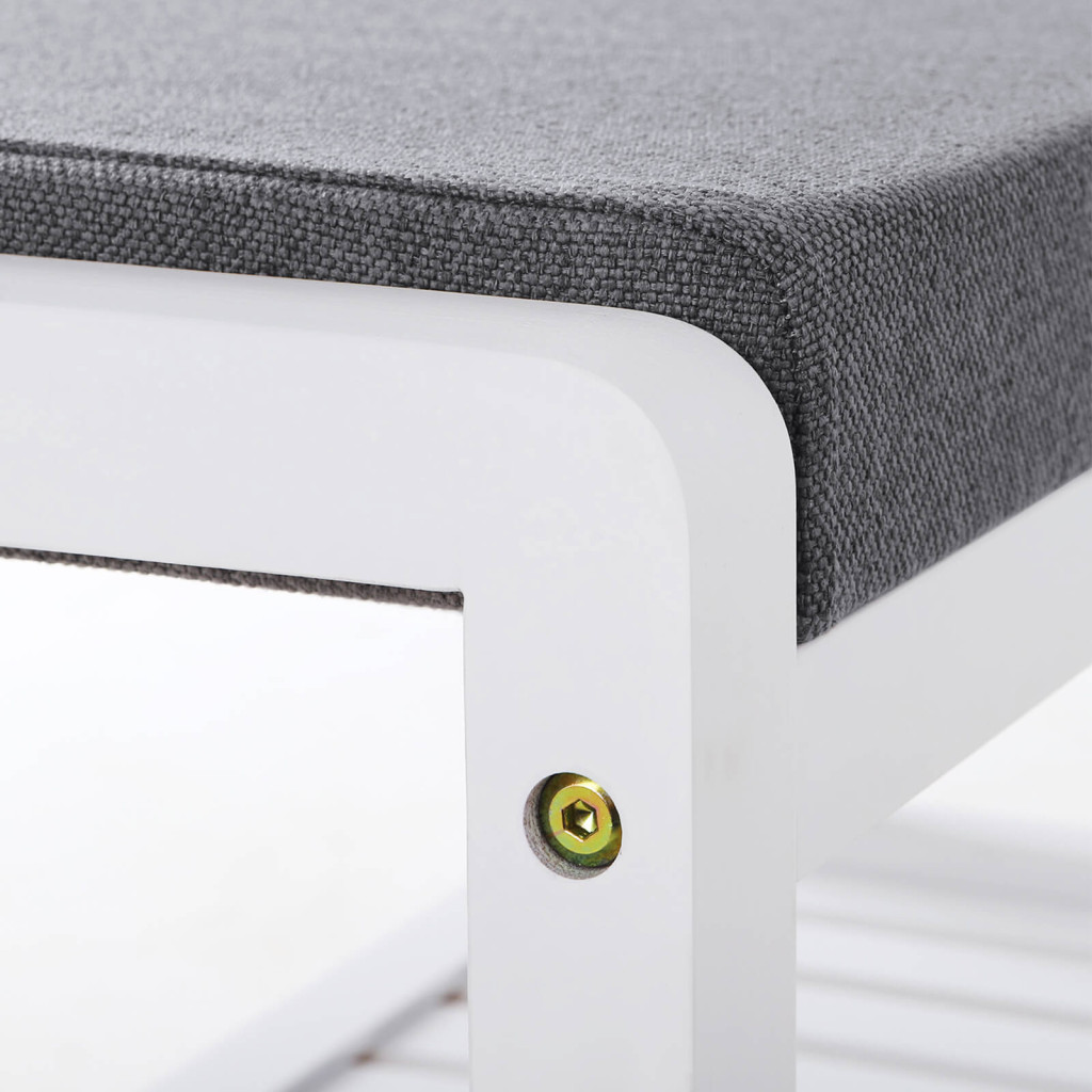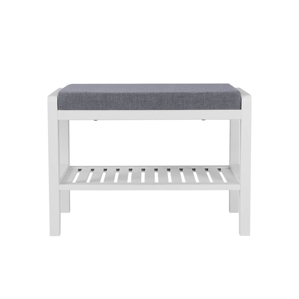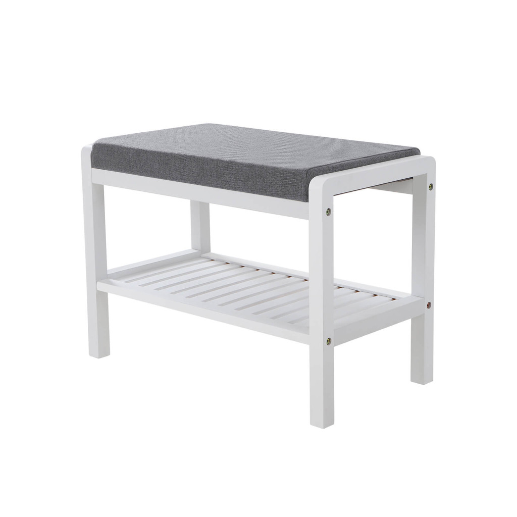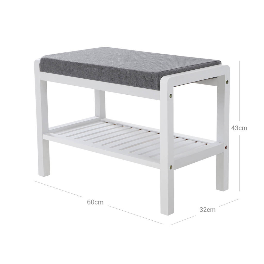 Ez az elegáns fehér bambusz cipőspad ötvözi a funkcionalitást és a kényelmet. A magas sűrűségű szivacspárnázat és légáteresztő szövetborítás kellemes ülőfelületet biztosít, míg az alsó polc helyet ad kedvenc cipőinek.