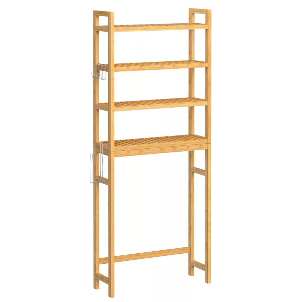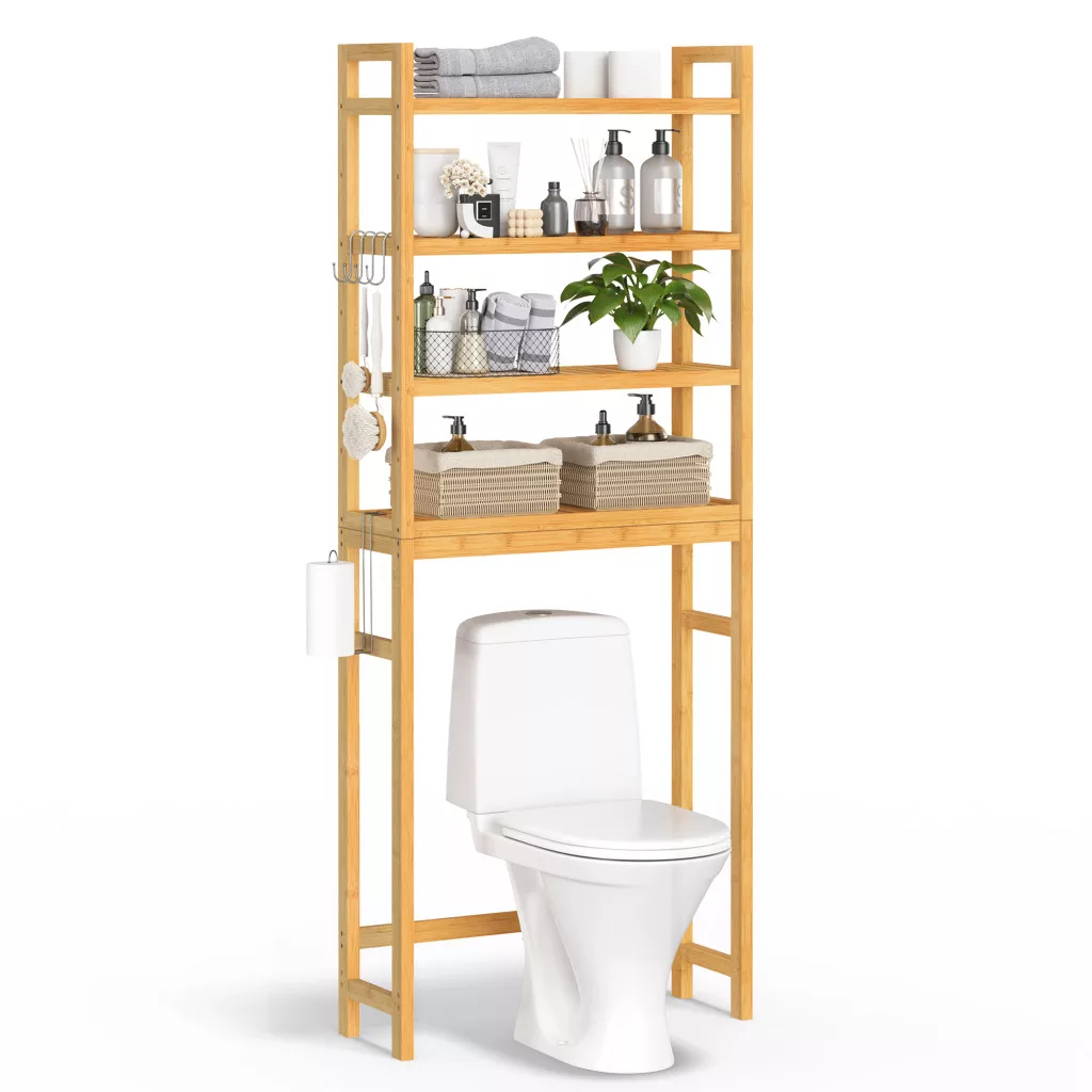Maximalizálja fürdőszobája tárolókapacitását ezzel a 4 polcos, bambuszból készült, WC fölé helyezhető állvánnyal, amely elegáns megoldást kínál törölközők, tisztálkodási szerek és egyéb fürdőszobai kellékek tárolására.