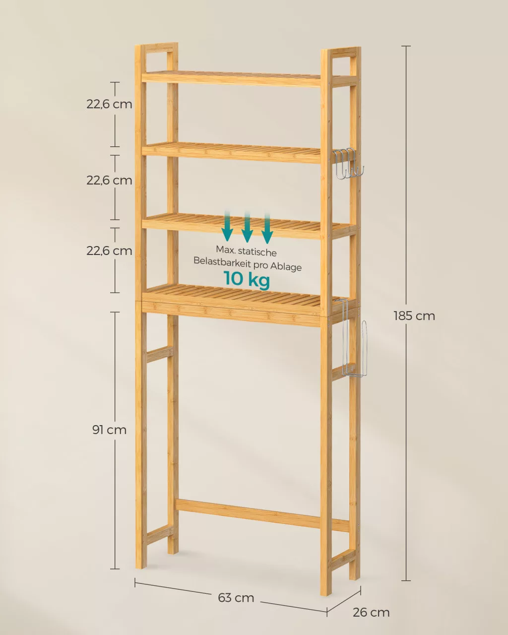 A 4 állítható magasságú polc, kiegészítve akasztókkal és WC-papír tartóval, lehetővé teszi a személyre szabott tárolást. A robusztus bambusz szerkezet garantálja a tartósságot, míg a természetes anyag használata környezetbarát választássá teszi.