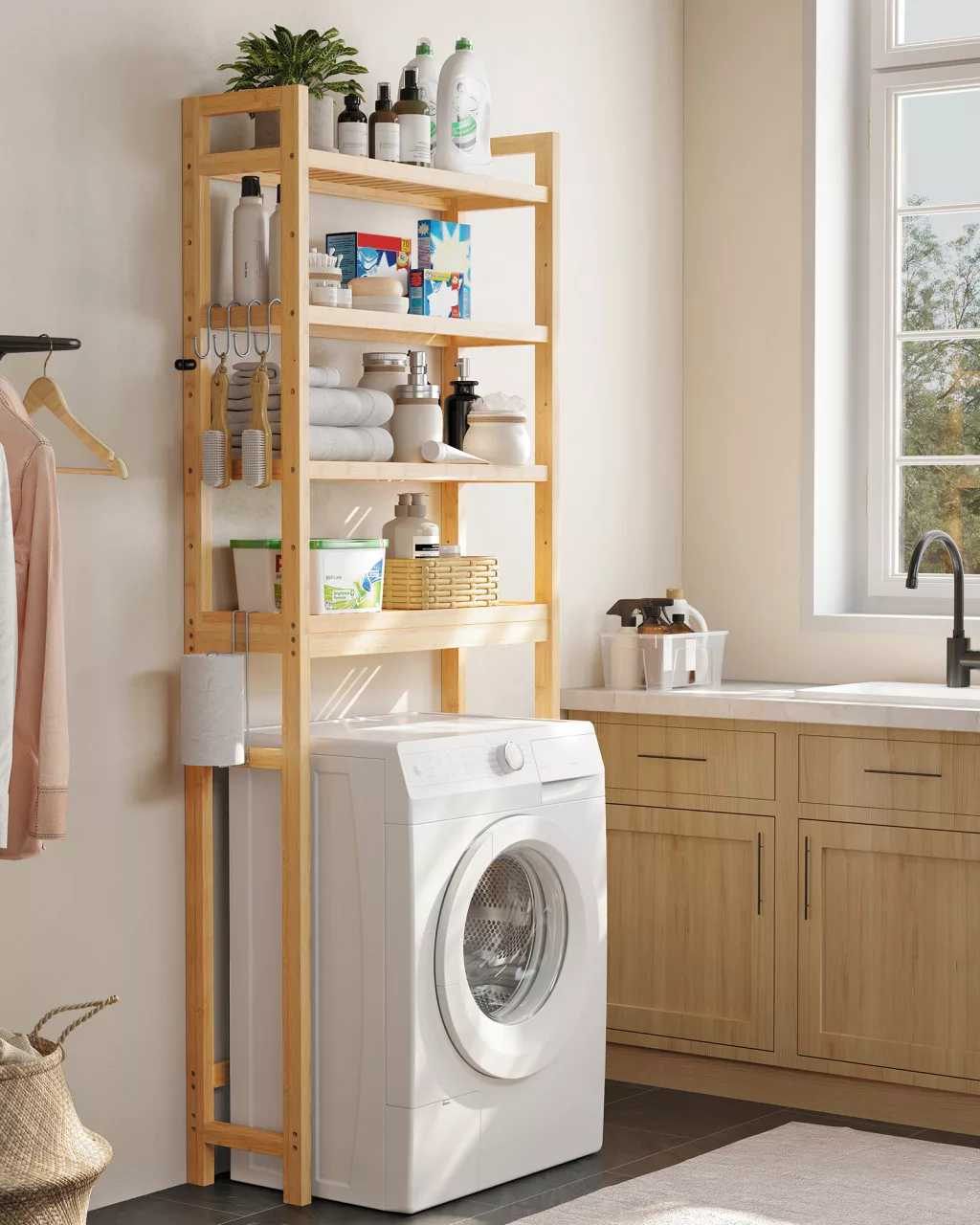 Ez a sokoldalú fürdőszobai állvány tökéletes megoldást nyújt a korlátozott fürdőszobai tér maximális kihasználására. A természetes bambuszból készült bútor nem csak praktikus tárolóhelyet biztosít, de stílusos megjelenésével a fürdőszoba dekoratív elemévé is válik.