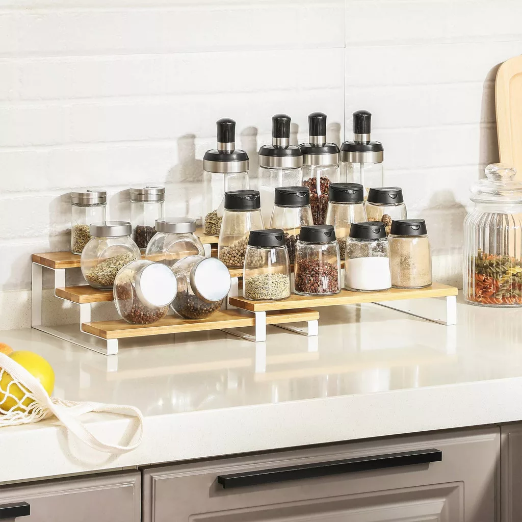 SONGMICS Bambusz Fűszertartó Állvány Szett 3-Szintes Kihúzható Polcrendszer Természetes-Fehér