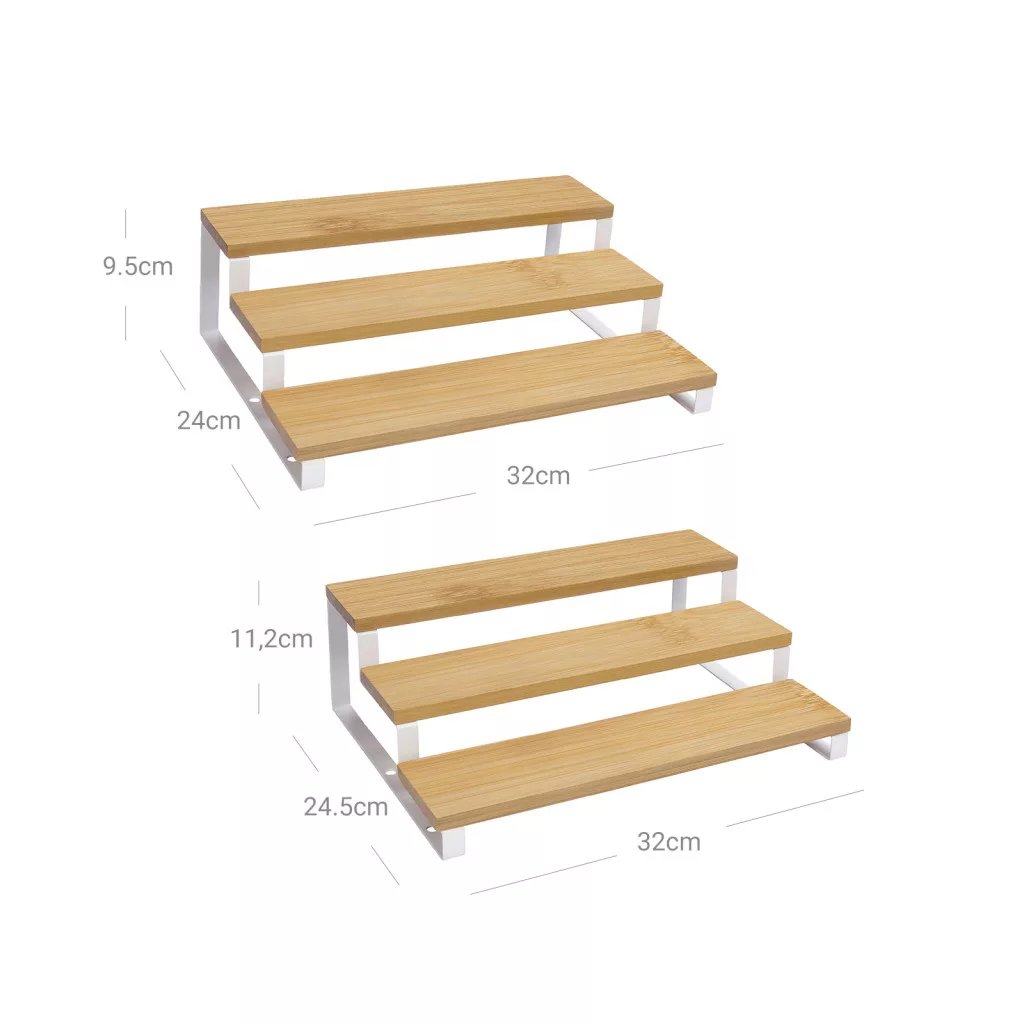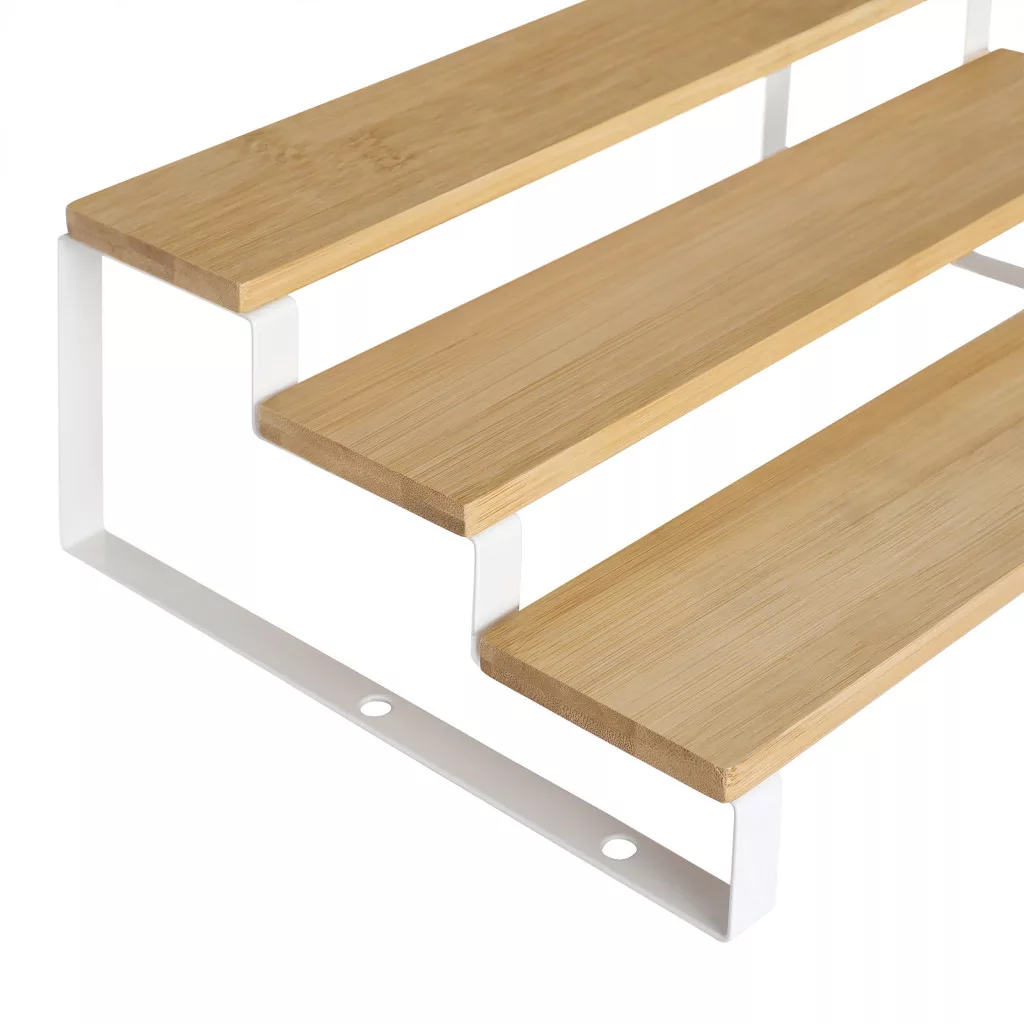 Praktikus, 3-szintes bambusz és acél fűszertartó szett, amely tökéletes megoldást nyújt a konyhai fűszerek és kozmetikumok rendszerezett tárolására.