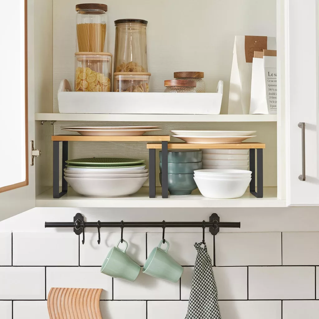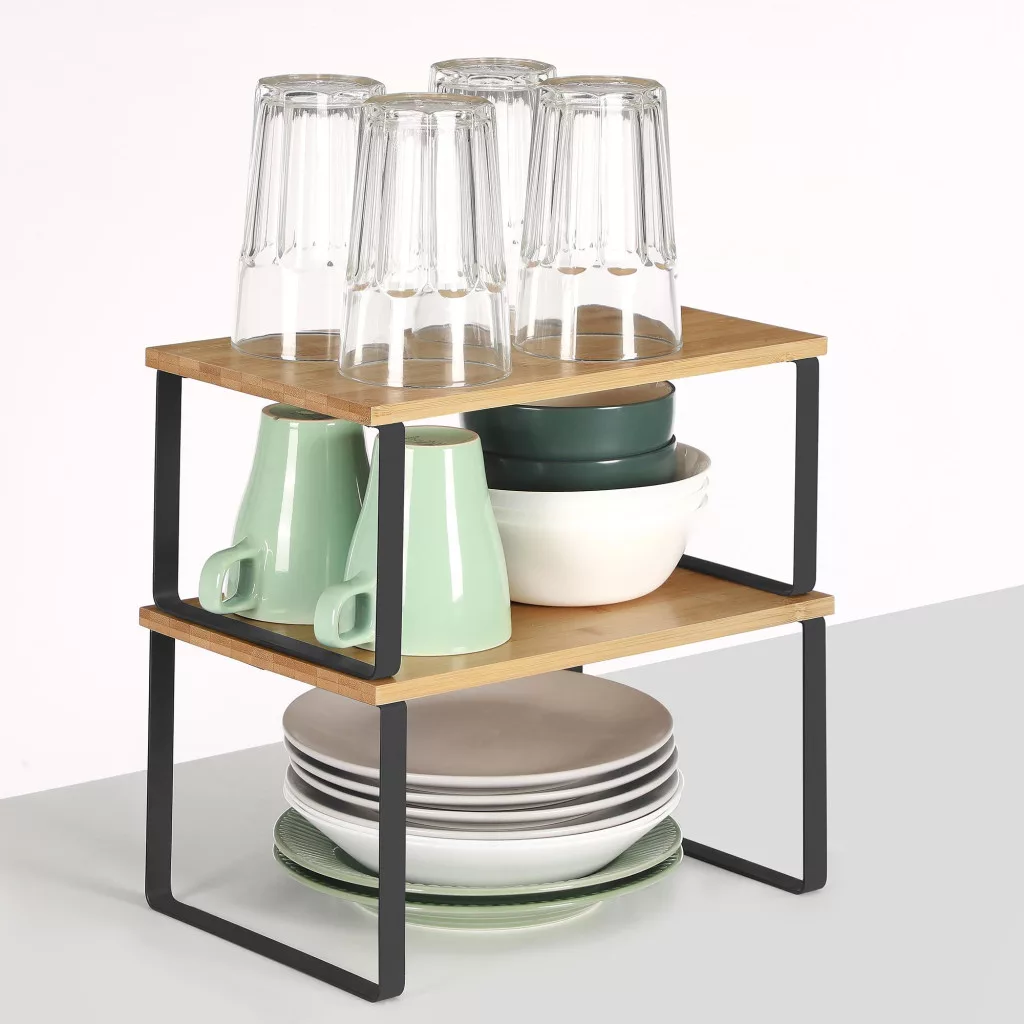 Stílusos és praktikus 2 részes bambusz-fém polcrendszer a konyhai tárolás maximalizálásához, amely tökéletes megoldást nyújt fűszerek, edények és egyéb konyhai eszközök rendszerezett tárolására.