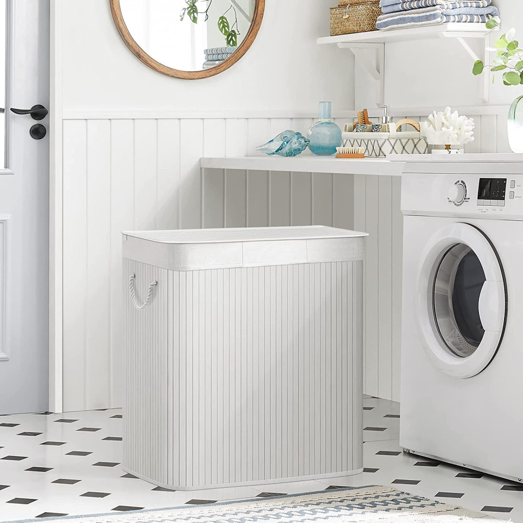 SONGMICS Bambusz Szennyestartó 150L Fehér Összecsukható 3 Rekeszes Fedeles Kosár