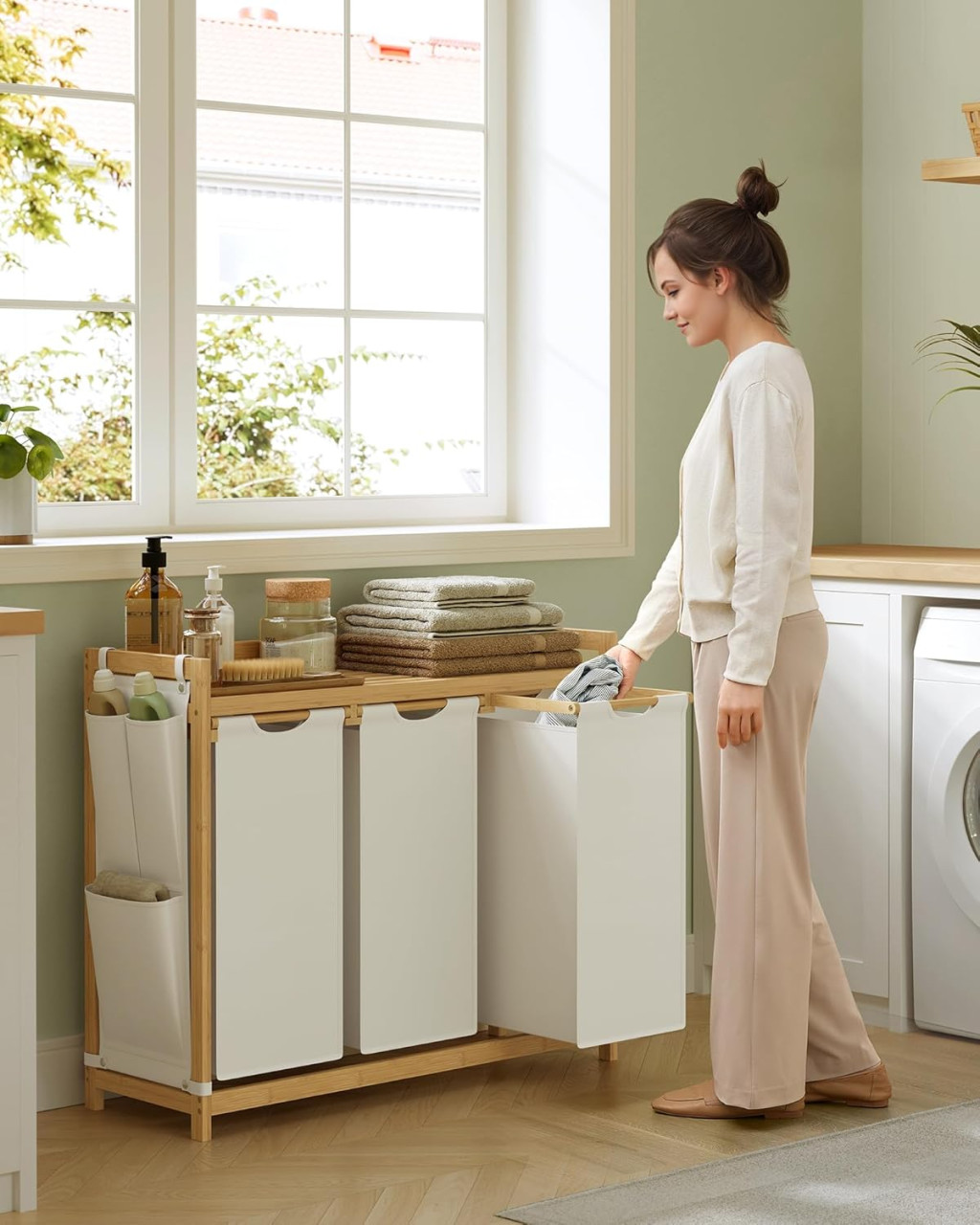 Ez a prémium kivitelű szennyestartó ötvözi a funkcionalitást és az esztétikumot. A természetes bambusz váz és a krémfehér Oxford szövet kosarak harmonikus megjelenést kölcsönöznek, míg a három 50 literes rekesz lehetővé teszi a ruhák színek vagy típusok szerinti szétválogatását.