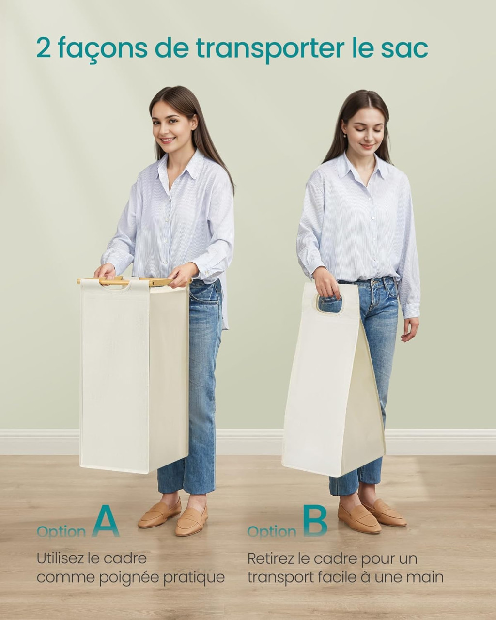 A természetes bambuszból készült váz nem csak stabil és tartós, de esztétikus megjelenést is kölcsönöz. A kivehető, tépőzáras mosózsákok megkönnyítik a ruhák szállítását, míg az oldalsó védőelemek megakadályozzák a tárgyak kiesését.