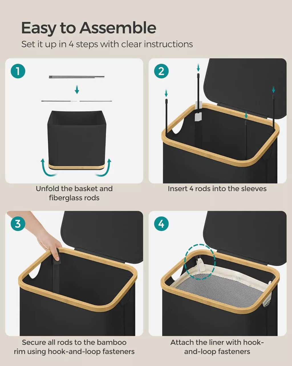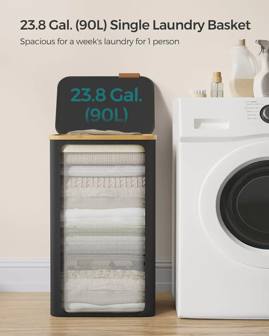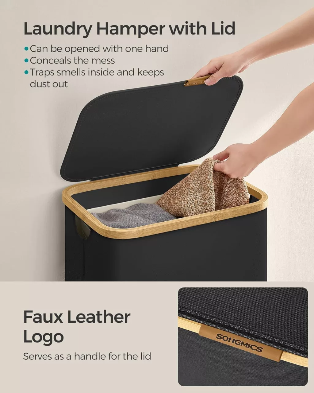 SONGMICS Bambusz Szennyestartó Kosár 90L Fekete Oxford Szövet Kivehető Hálós Béléssel