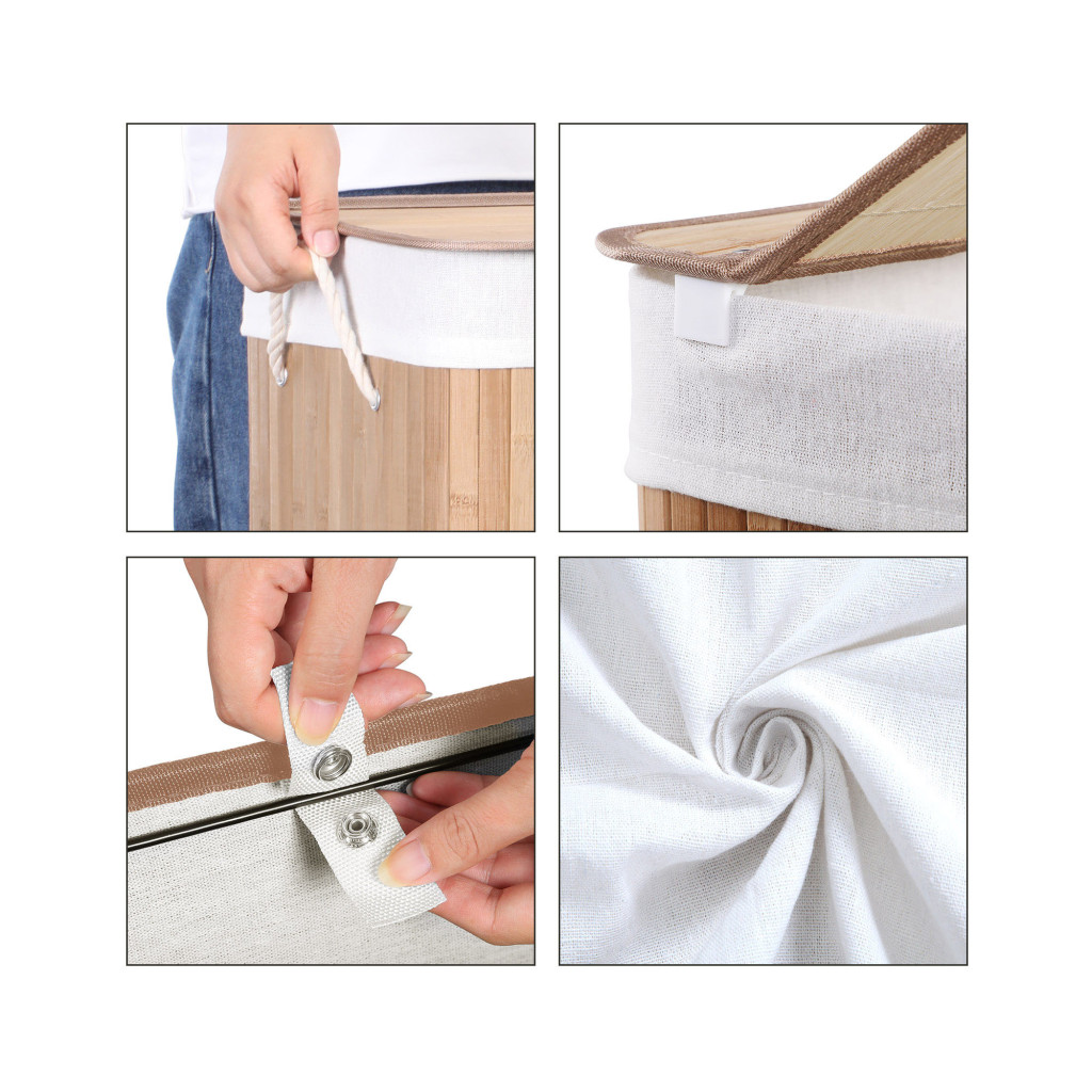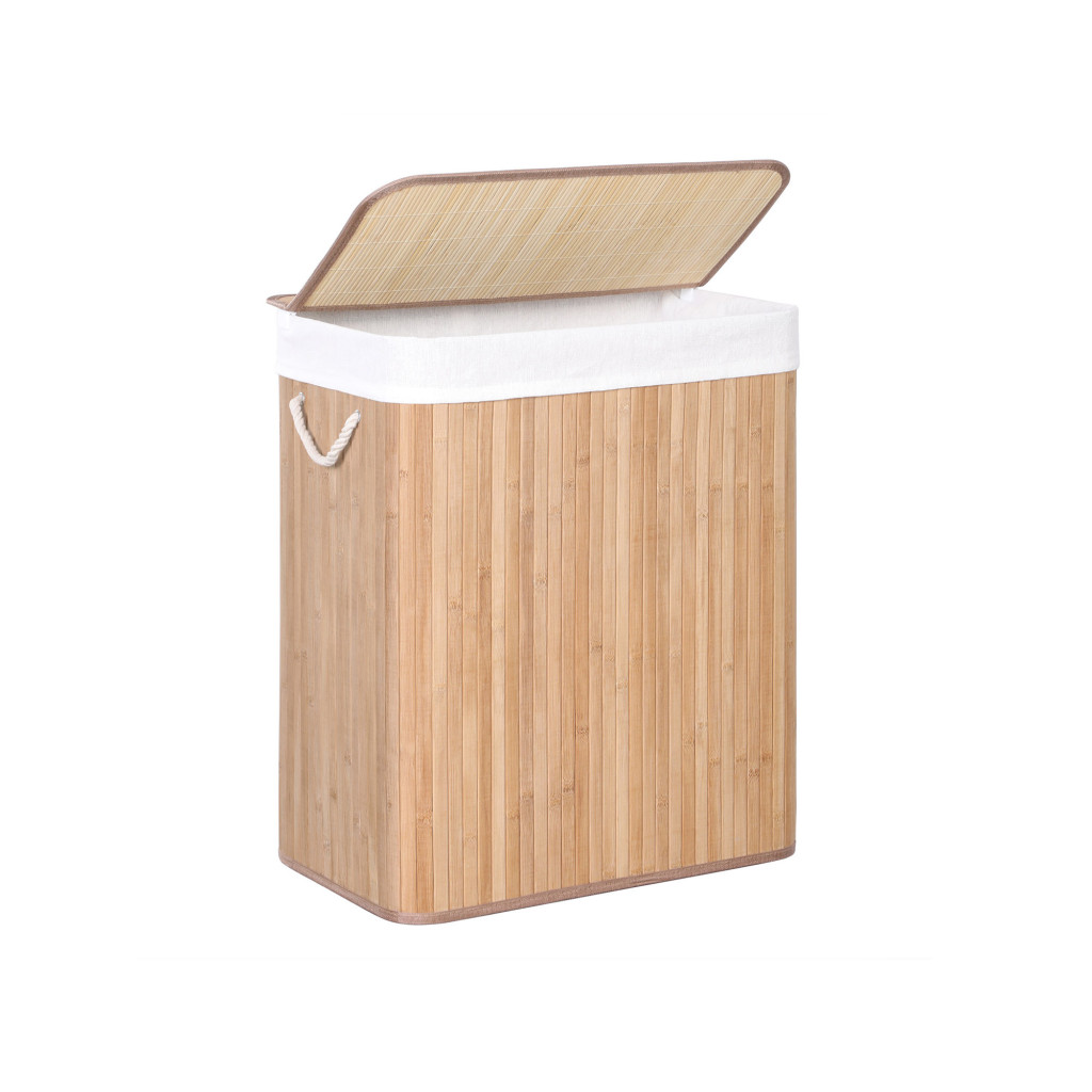 Elegáns bambusz szennyestartó praktikus csiptetős fedéllel és kivehető béléssel, amely tökéletes megoldást nyújt a szennyes ruhák tárolására 100 literes kapacitással.