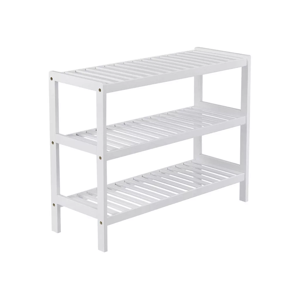 Elegáns, fehér bambusz tárolópolc 3 szinttel, amely tökéletes megoldást nyújt cipők, fürdőszobai kellékek vagy egyéb tárgyak rendszerezett tárolására.