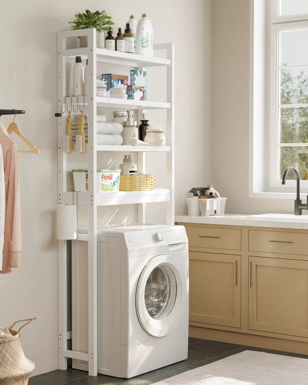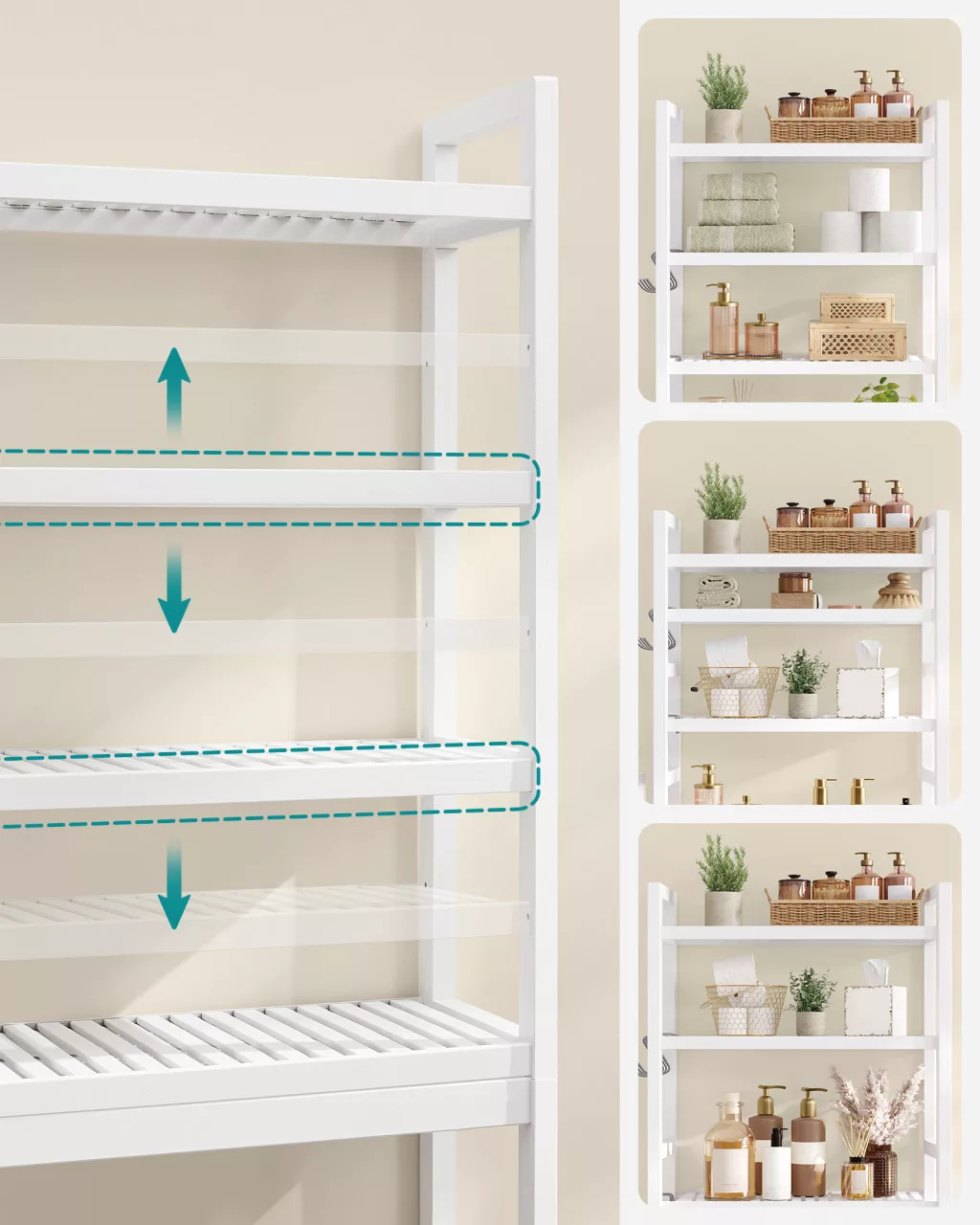 Ez a sokoldalú fürdőszobai állvány tökéletes megoldást nyújt a korlátozott terek maximális kihasználására. A 4 állítható magasságú polc, kiegészítő akasztók és WC-papír tartó praktikus tárolóhelyet biztosít törölközők, kozmetikumok és fürdőszobai kellékek számára.