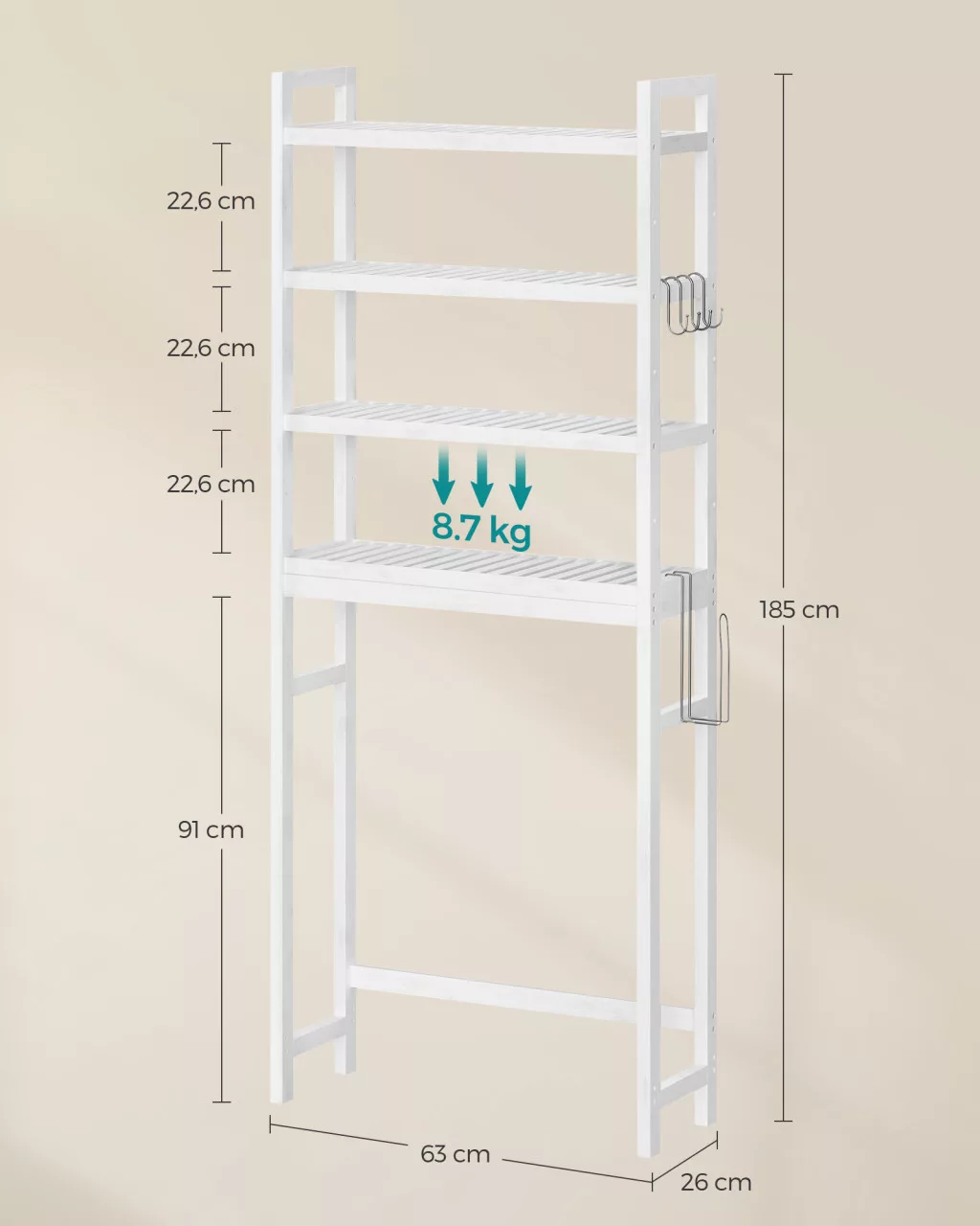 Maximalizálja fürdőszobája tárolókapacitását ezzel a 4-szintes, állítható polcokkal rendelkező, WC fölé helyezhető bambusz állvánnyal, amely elegáns fehér kivitelben készült.
