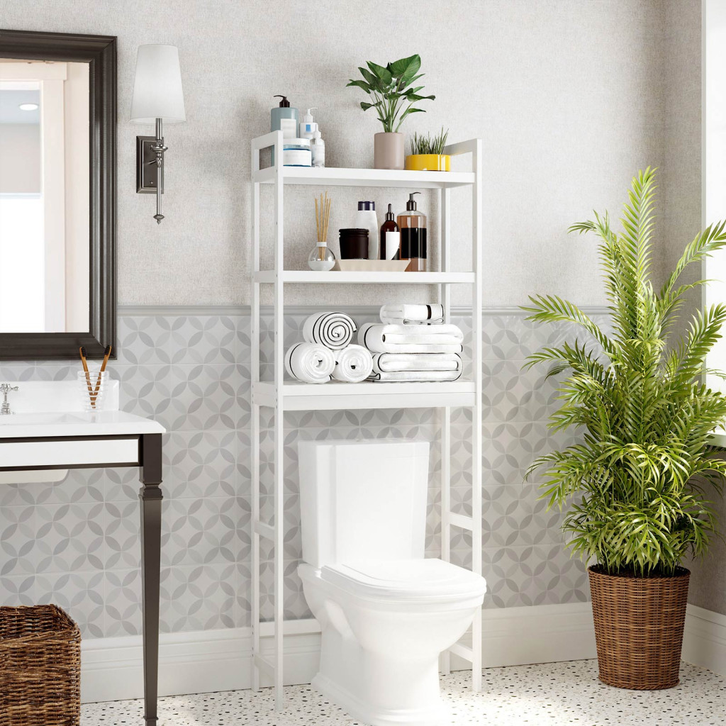 Elegáns, fehér bambusz fürdőszobai állvány állítható polcokkal, amely maximalizálja a WC feletti teret és stílusos tárolási megoldást kínál.