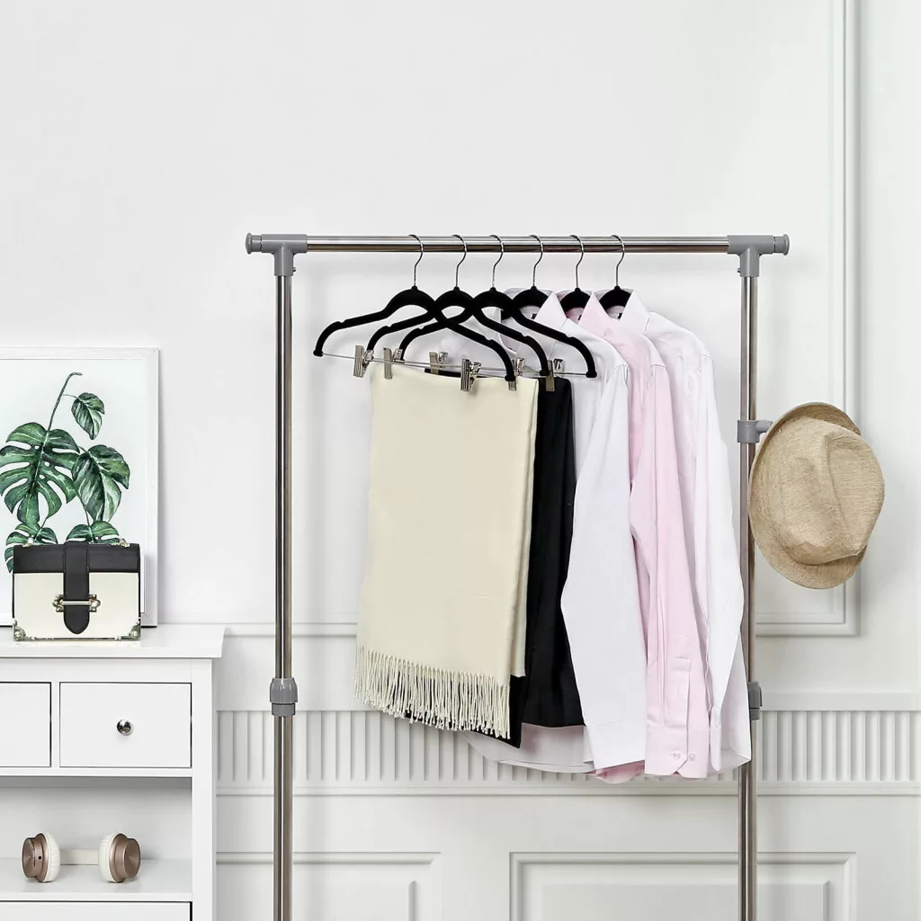 A SONGMICS bársonyozott vállfaszett forradalmasítja a ruhatárolást. A különleges, mindössze 6 mm vékony kialakítás jelentősen növeli a szekrény tárolókapacitását, míg a csúszásmentes bársony felület megóvja a ruhákat a lecsúszástól. Az állítható csipeszek tökéletesen alkalmazkodnak különböző méretű ruhadarabokhoz.