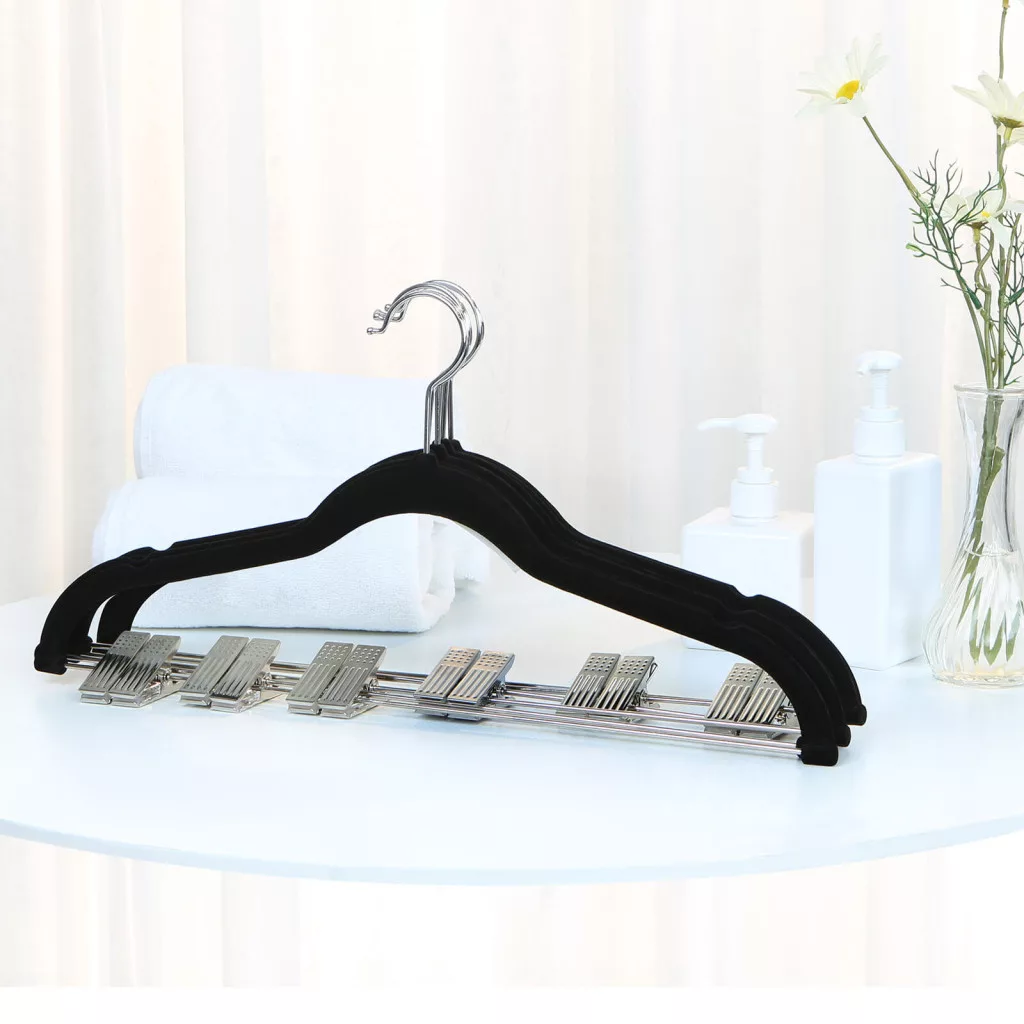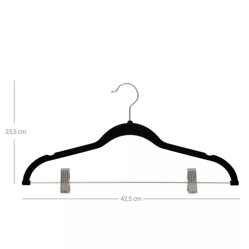 Prémium minőségű, 12 darabos bársonyozott vállfaszett állítható csipeszekkel nadrágok, szoknyák és egyéb ruhadarabok tárolásához. A vékony kialakítás maximális helykihasználást biztosít.