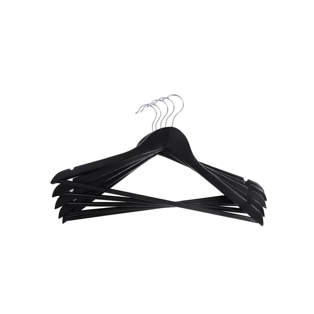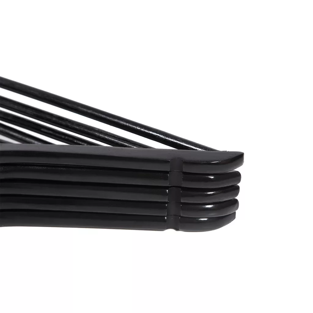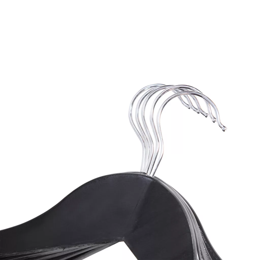 Prémium minőségű juharfa ruhavállfa szett 10 darabos kiszerelésben, amely elegáns fekete kivitelben és ergonomikus kialakítással gondoskodik ruháid tökéletes tárolásáról és formájának megőrzéséről.