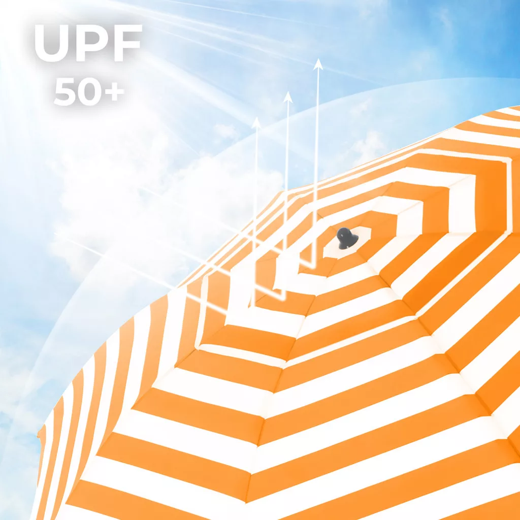 Ez a prémium minőségű napernyő tökéletes társa lesz minden szabadtéri tevékenységhez. A PA-bevonatú, UPF50+ védelemmel ellátott ernyő hatékonyan óv a káros UV-sugaraktól, míg a narancssárga-fehér csíkos dizájn stílusos megjelenést kölcsönöz.