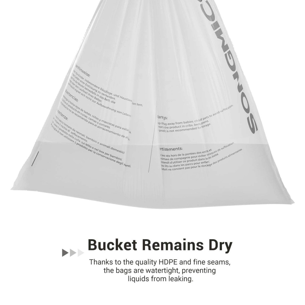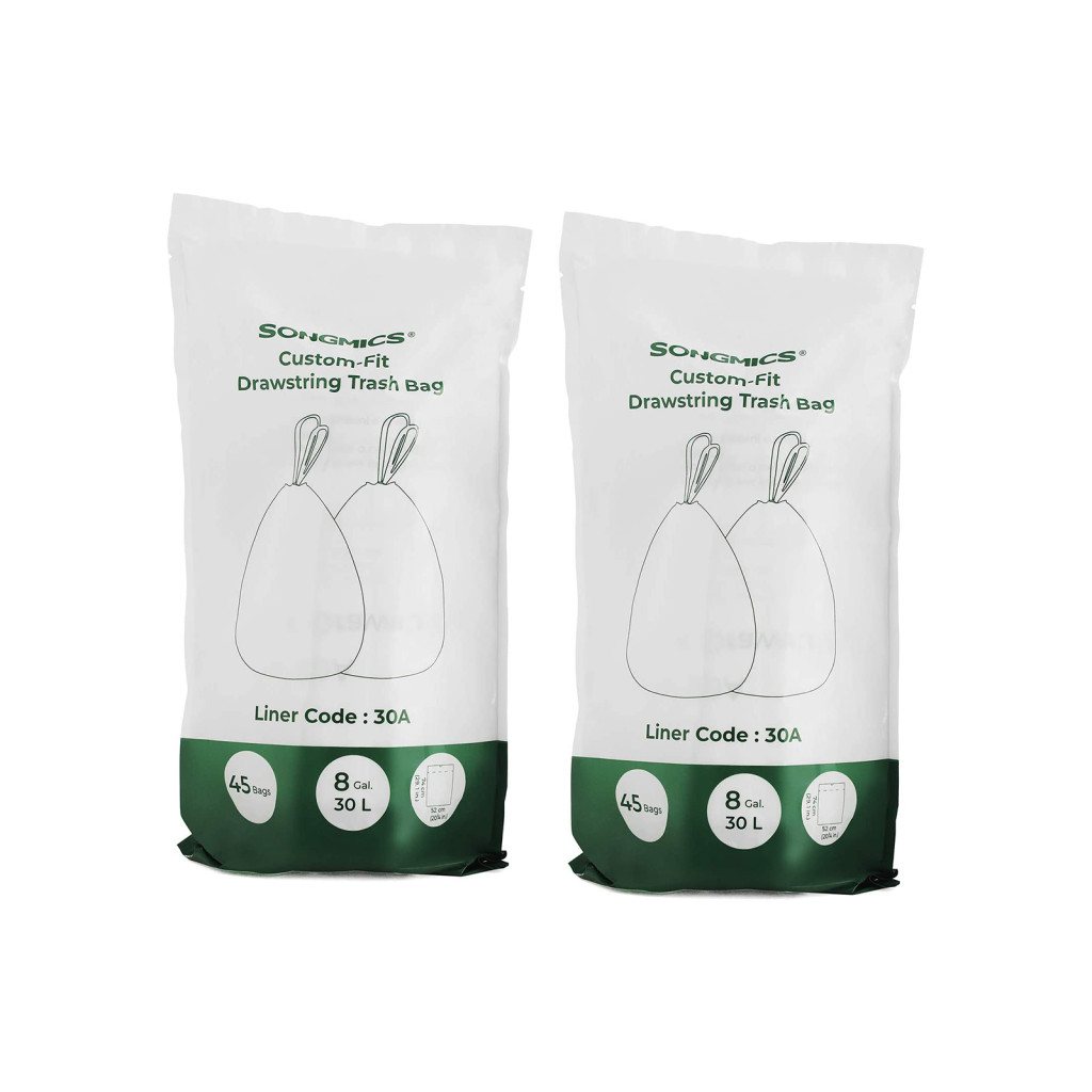 Speciálisan tervezett, erős húzózsinóros szemeteszsákok a SONGMICS 30L-es kukákhoz, dupla varrással és szivárgásmentes kialakítással.