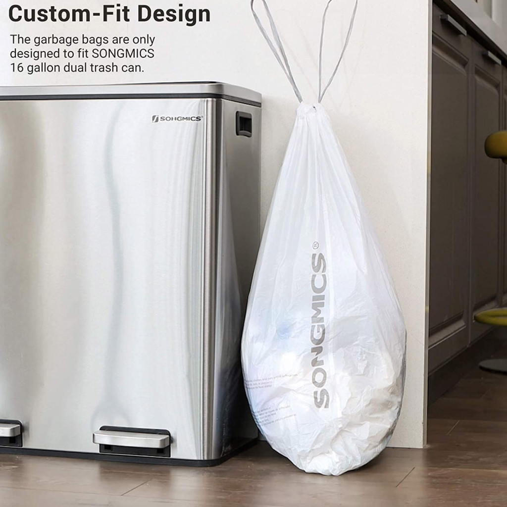 A SONGMICS húzózsinóros szemeteszsákok kifejezetten a 30L-es SONGMICS szemeteskukákhoz lettek tervezve, biztosítva a tökéletes illeszkedést és a problémamentes használatot. A dupla varrással megerősített, vastag műanyagból készült zsákok megbízhatóan tartják a hulladékot és a folyadékokat.