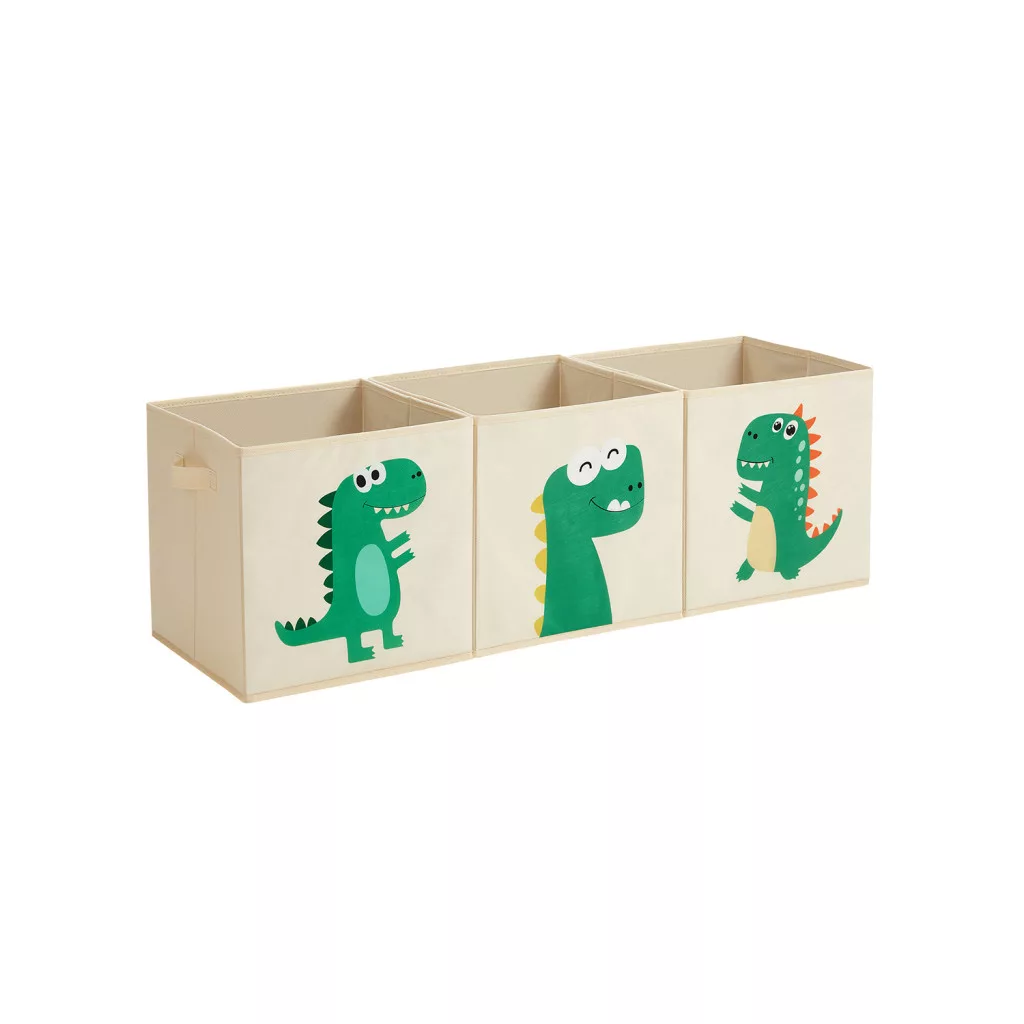 Aranyos dinoszaurusz mintás, 3 darabos tárolódoboz készlet, amely tökéletes megoldást nyújt a játékok, könyvek és ruhák rendszerezésére a gyerekszobában.