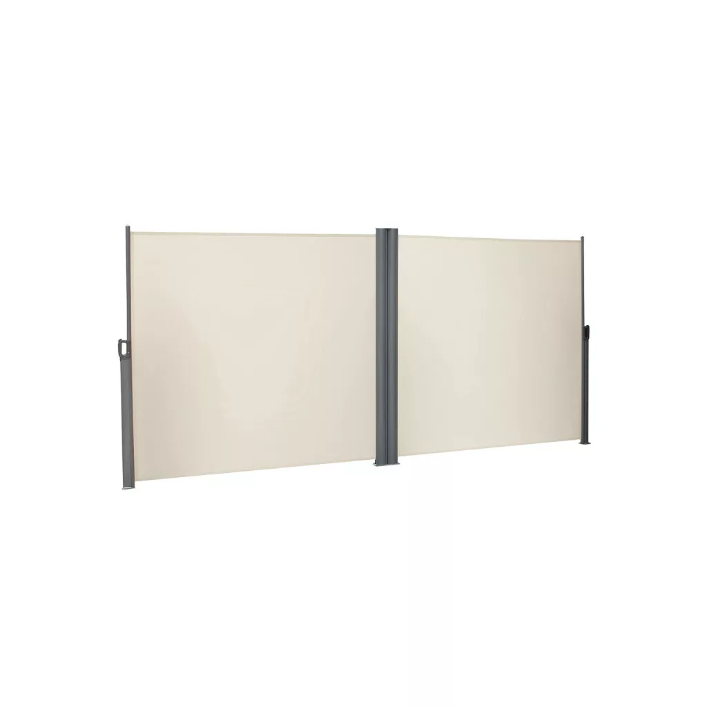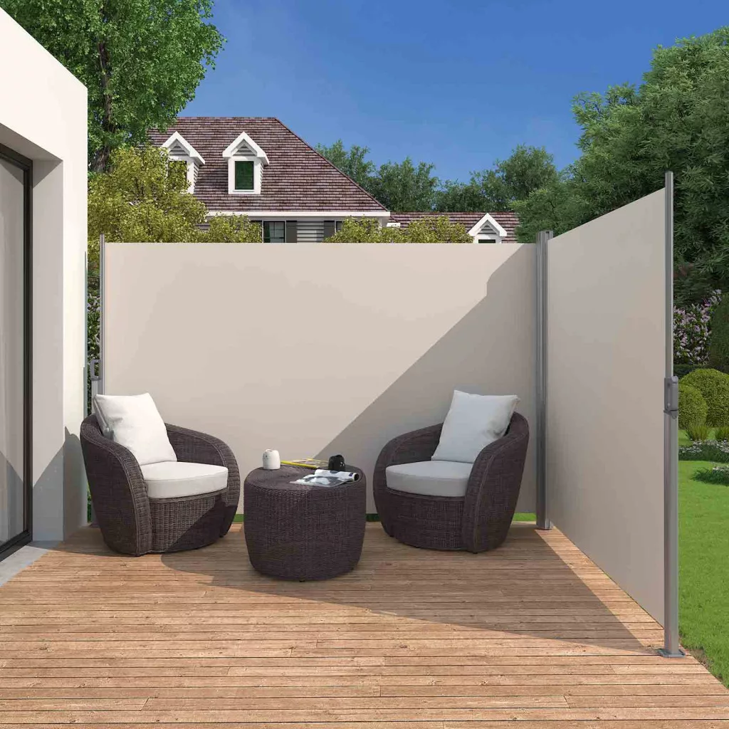 Kiváló minőségű, kihúzható dupla oldalsó napellenző, amely tökéletes megoldást nyújt a terasz vagy kert privát szférájának megteremtéséhez és a napfény elleni védelemhez.