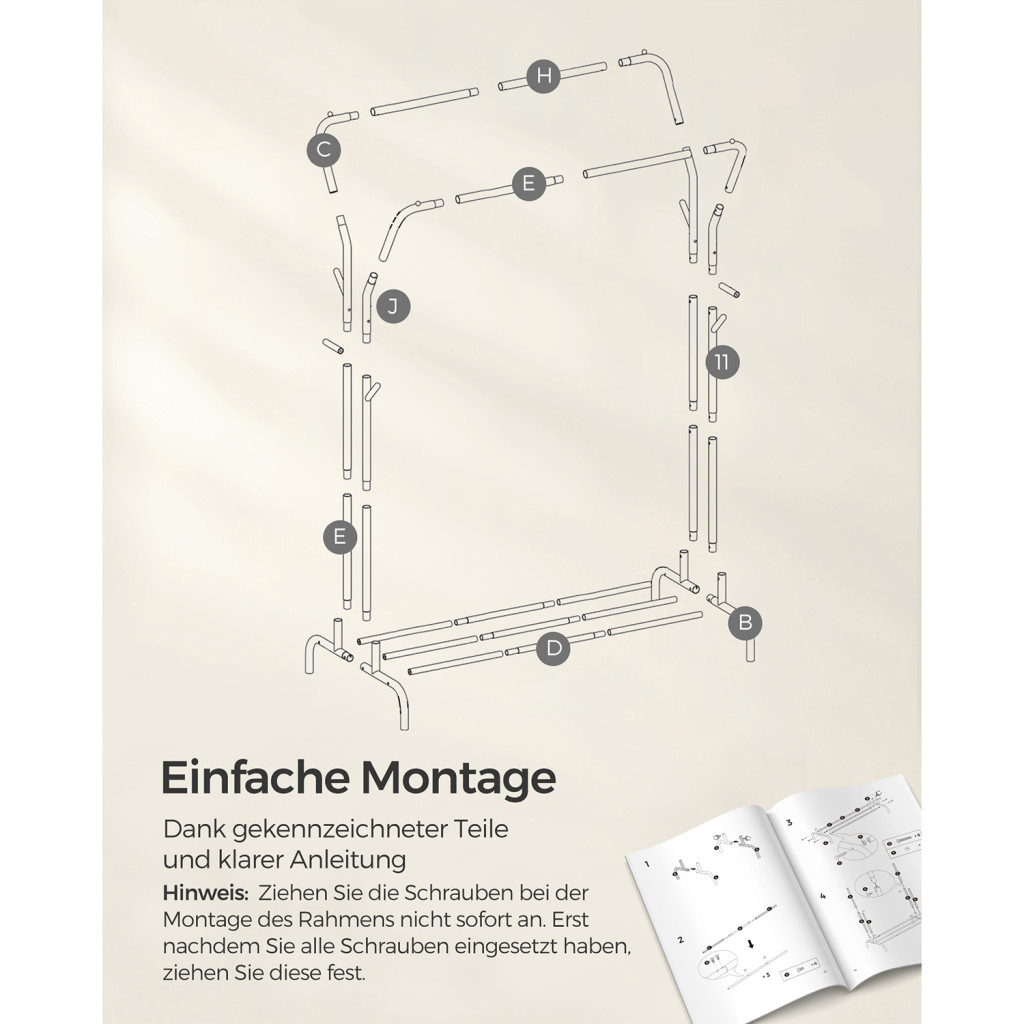 Ez a praktikus dupla ruhaállvány tökéletes megoldást nyújt a ruhatár rendszerezett tárolására. A felső és alsó rúd lehetővé teszi különböző hosszúságú ruhák elhelyezését, míg az oldalsó akasztók táskák és kiegészítők tárolására szolgálnak. A 25,4 mm vastag acélcsövekből készült váz kivételes stabilitást biztosít.