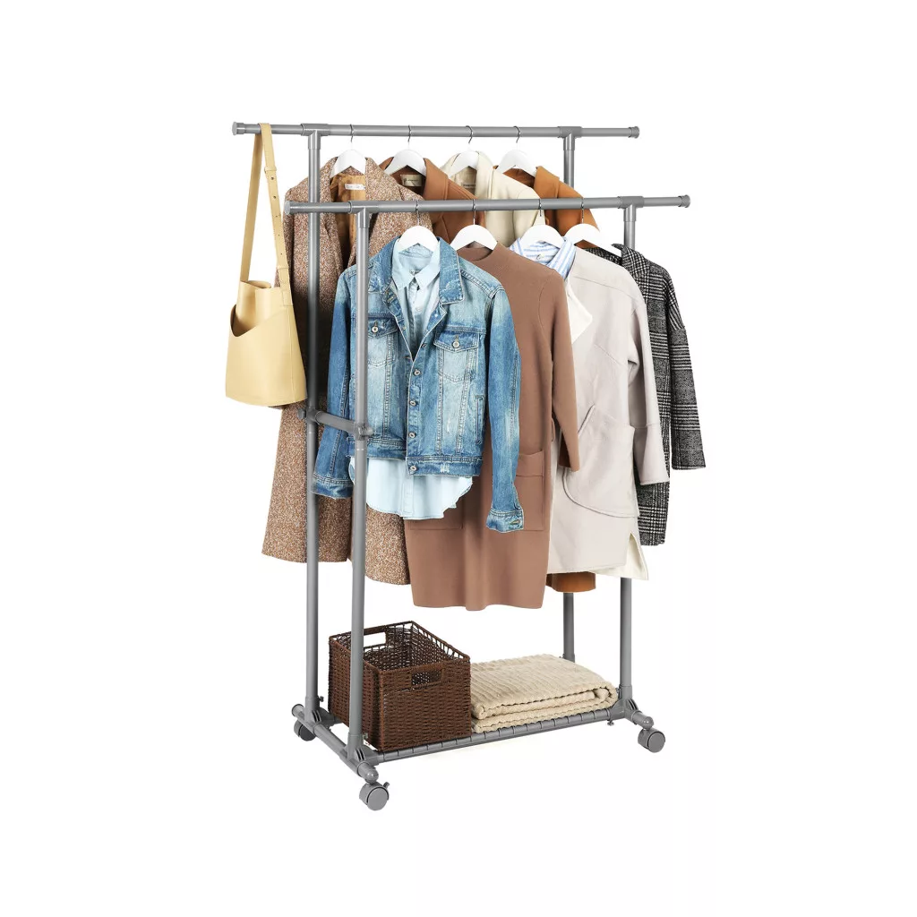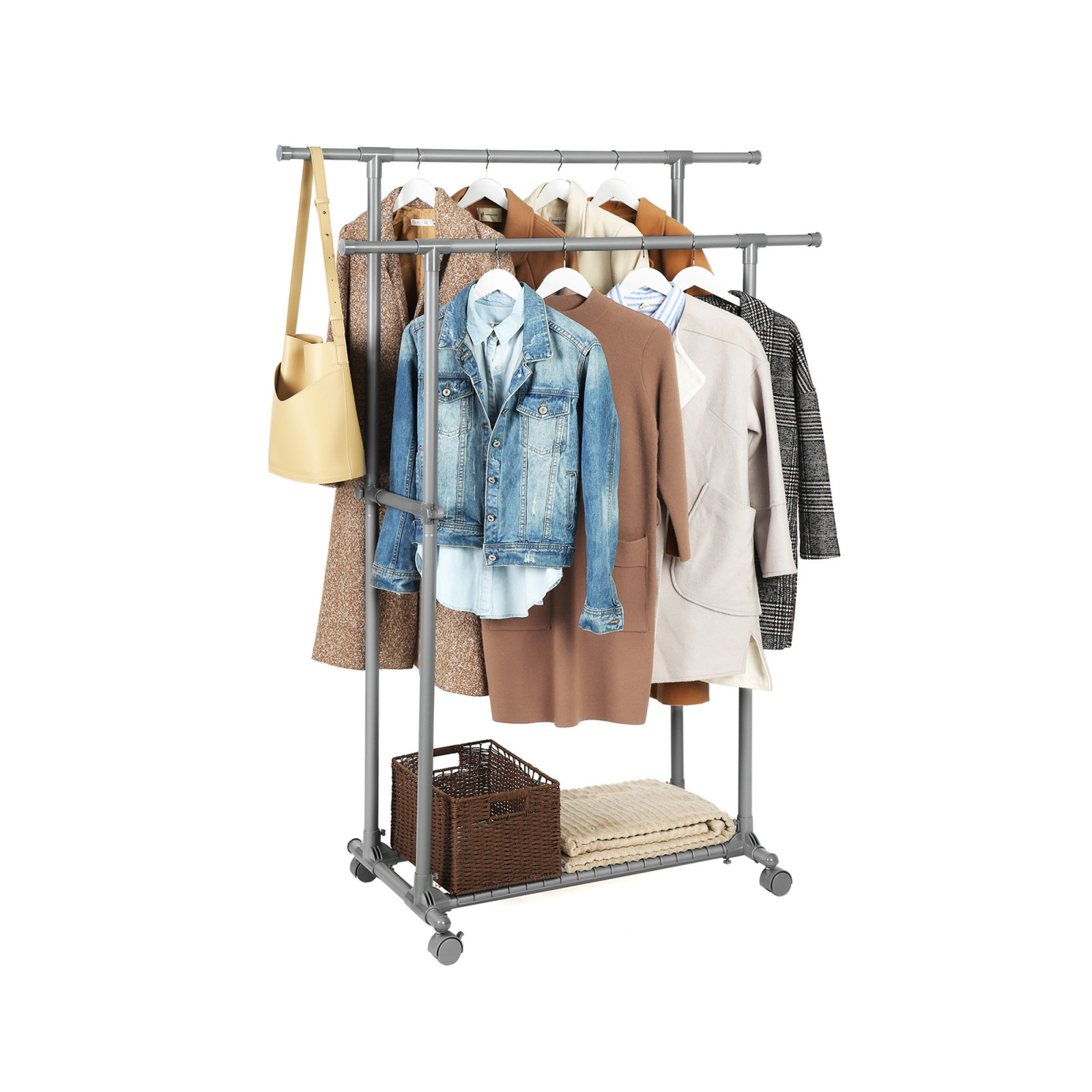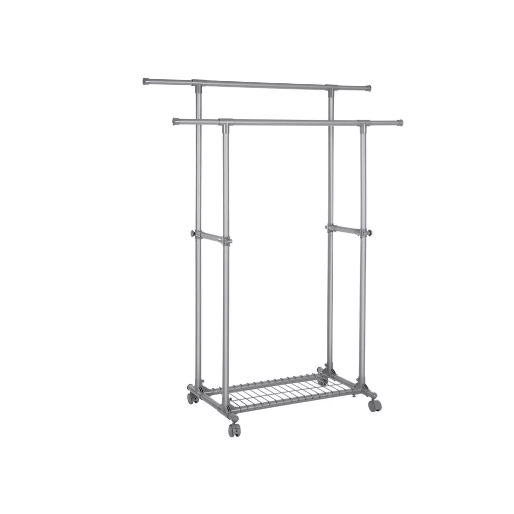 Praktikus, kihúzható dupla ruhaállvány 70 kg teherbírással, extra tárolópolccal és görgőkkel a maximális mobilitásért.