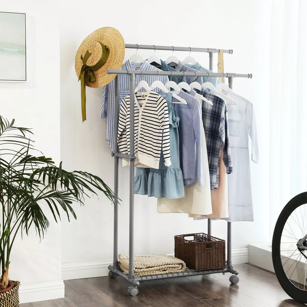 SONGMICS Dupla Ruhaállvány Kihúzható Szürke Gurulós Tárolópolccal