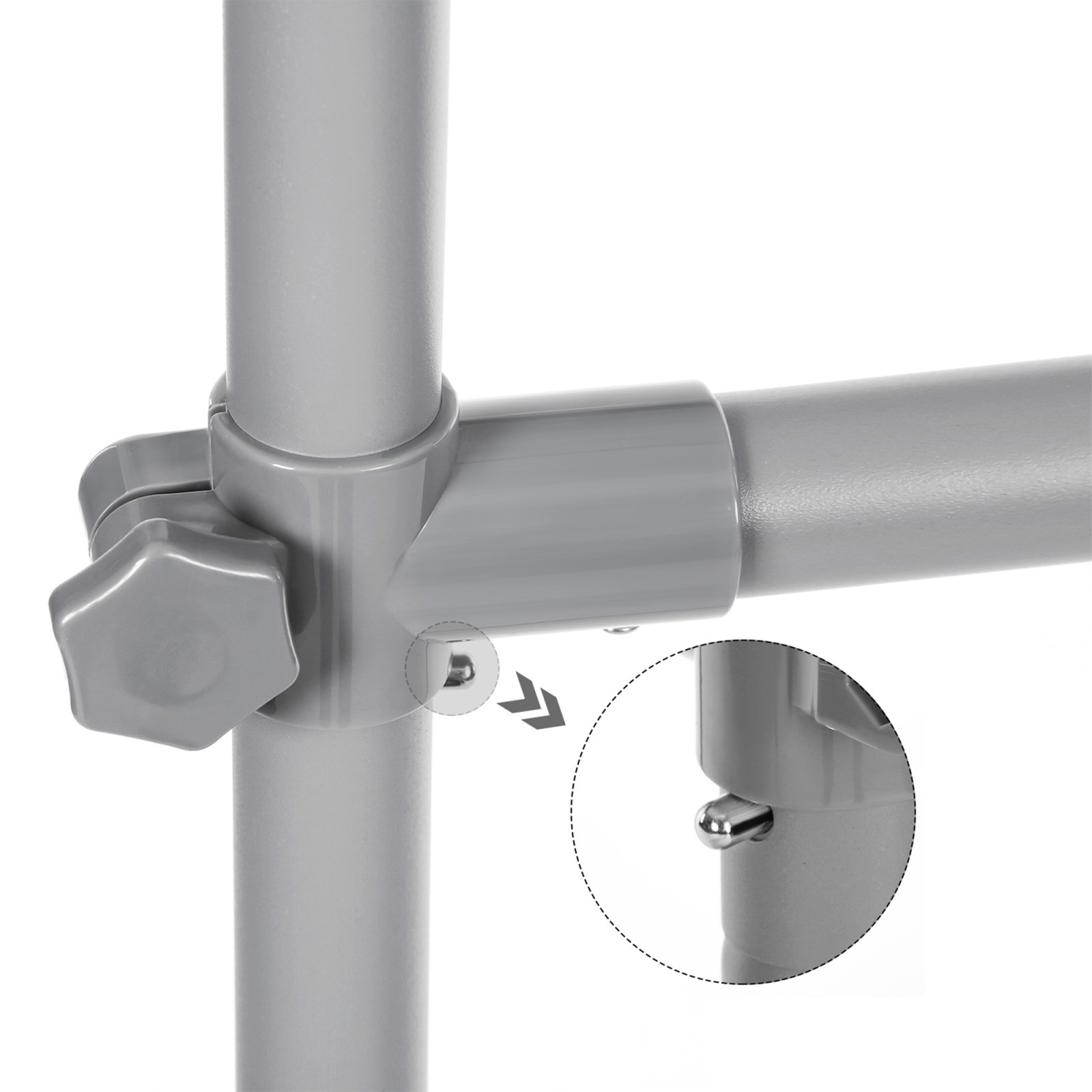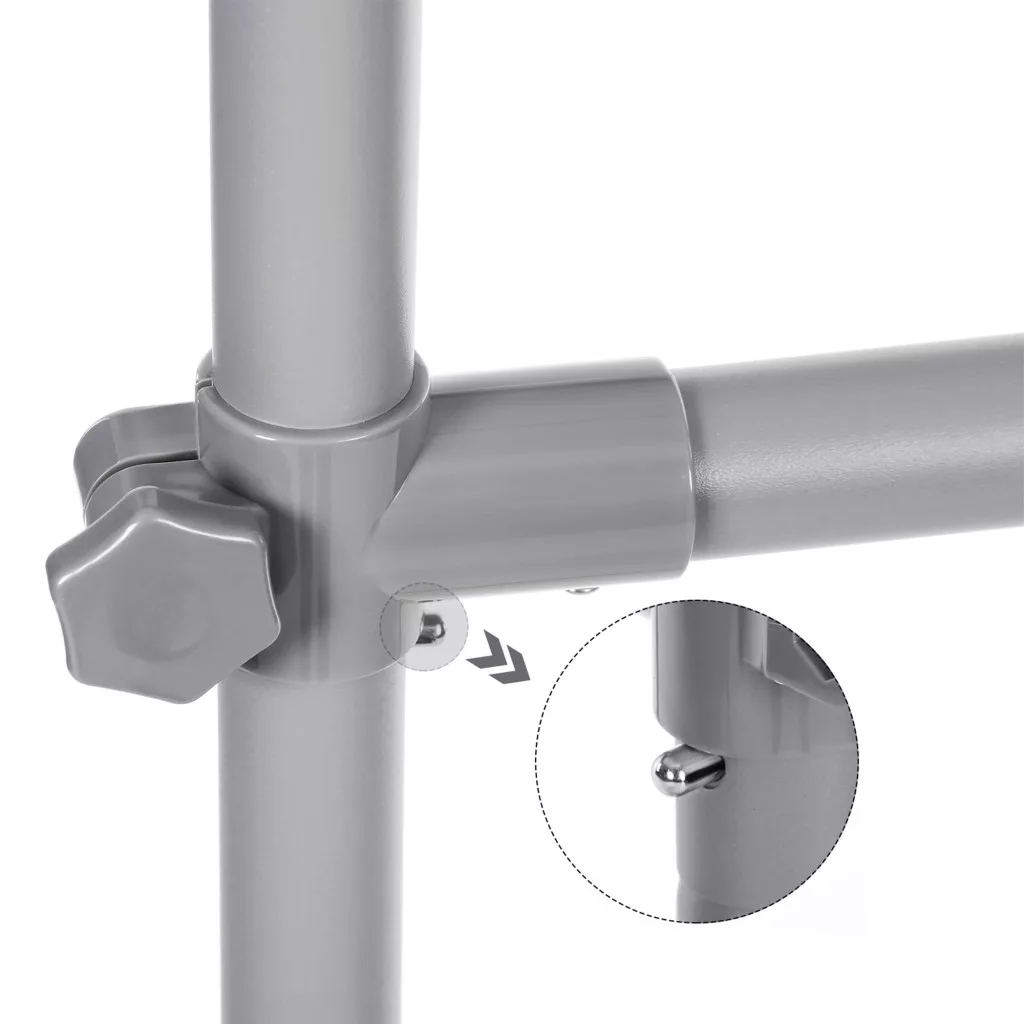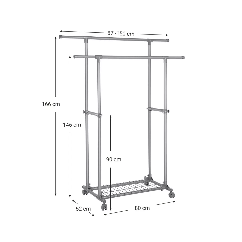 Ez a modern kialakítású, szürke porszórt bevonatú ruhaállvány tökéletes megoldást nyújt a ruhatár rendszerezéséhez. A két kihúzható rúd 87-150 cm között állítható, így rugalmasan alakítható a rendelkezésre álló helyhez. Az oldalsó rudak ideálisak sálak és övek tárolására, míg az alsó polc cipők és táskák elhelyezésére szolgál.