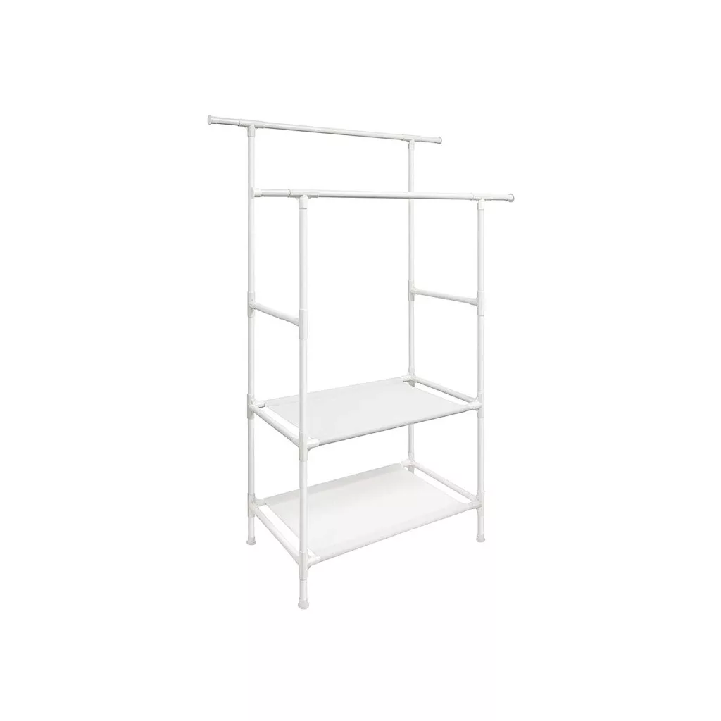 Stabil, dupla akasztósínnel és két polccal rendelkező ruhaállvány, amely tökéletes megoldást nyújt ruhái, cipői és kiegészítői rendszerezett tárolására.